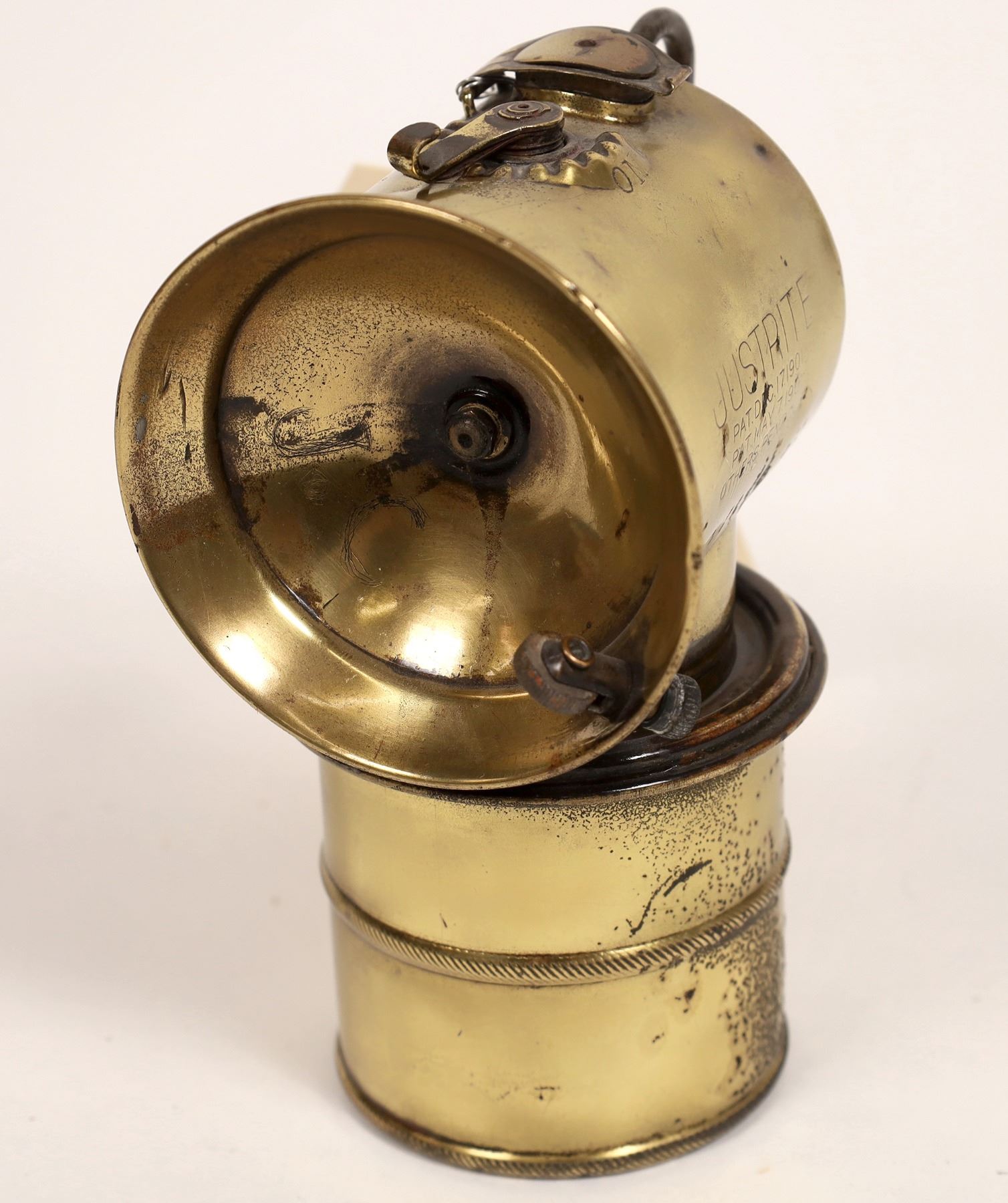 Justrite horizontal design carbide lamp. Upper cylinder diameter is 2.5 inches, lower canister diameter is also 2.5 inches. Reflector is 3 inches in diameter. Overall height is 6 inches. Brass construction still shiny with some spots of corrosion. Lower canister still unscrews smoothly. Embossed on the upper cylinder JUSTRITE / PAT.DEC.17,1901 / PAT. MAY 7,1901 / OTHERS PENDING