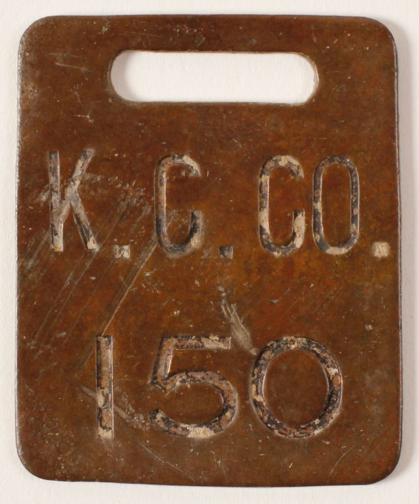 KC CO brass tool check #150 with manufacturer's stamp Moise K. Co. SF. Rectangular with slot at top. From Kennecott Copper Corp. at McGill, NV, that operated 1915 to 1983. Tag dates from period 1915 to 1930.Front scratches. Date: Location: McGill, Nevada HWAC# 571916