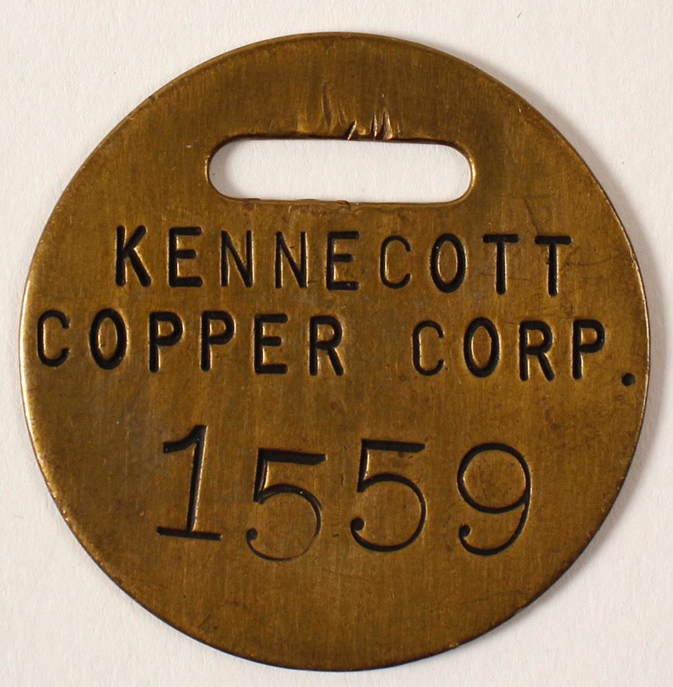 KENNECOTT COPPER CORP. brass tool check #1559. Round with slot at top. From company at McGill, NV, that operated 1915 to 1983. Tag dates from period 1940 to 1950 Date: Location: McGill, Nevada HWAC# 571938