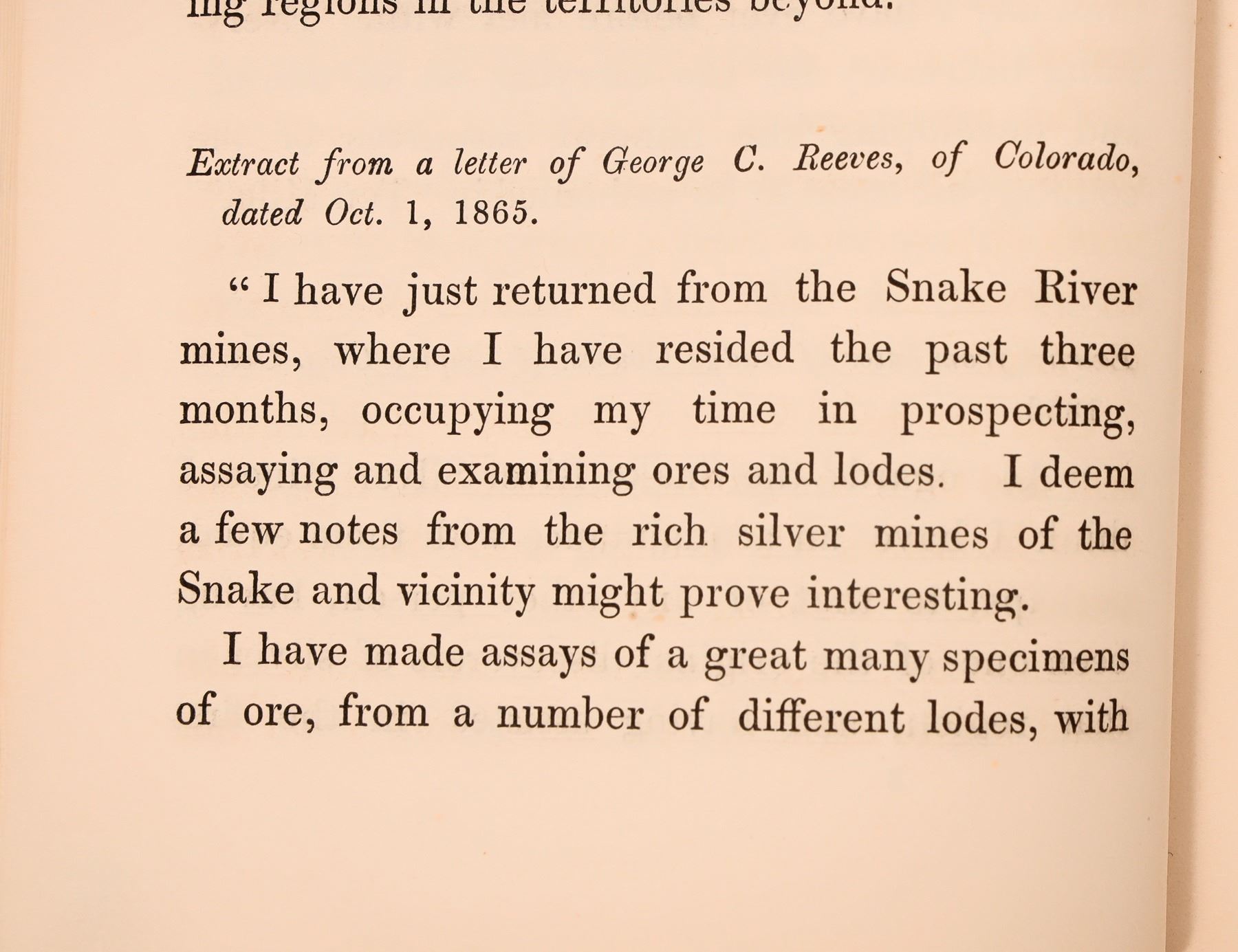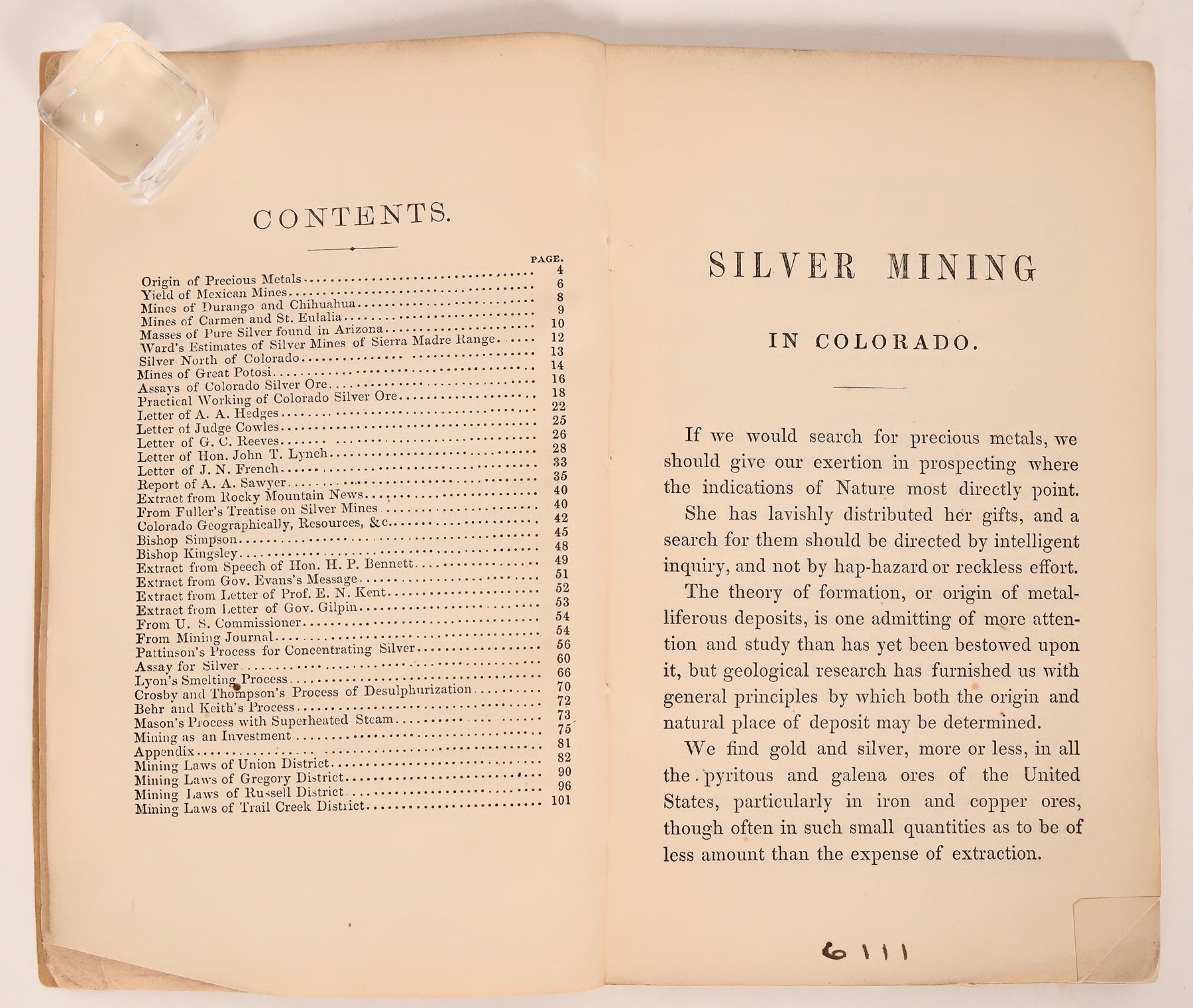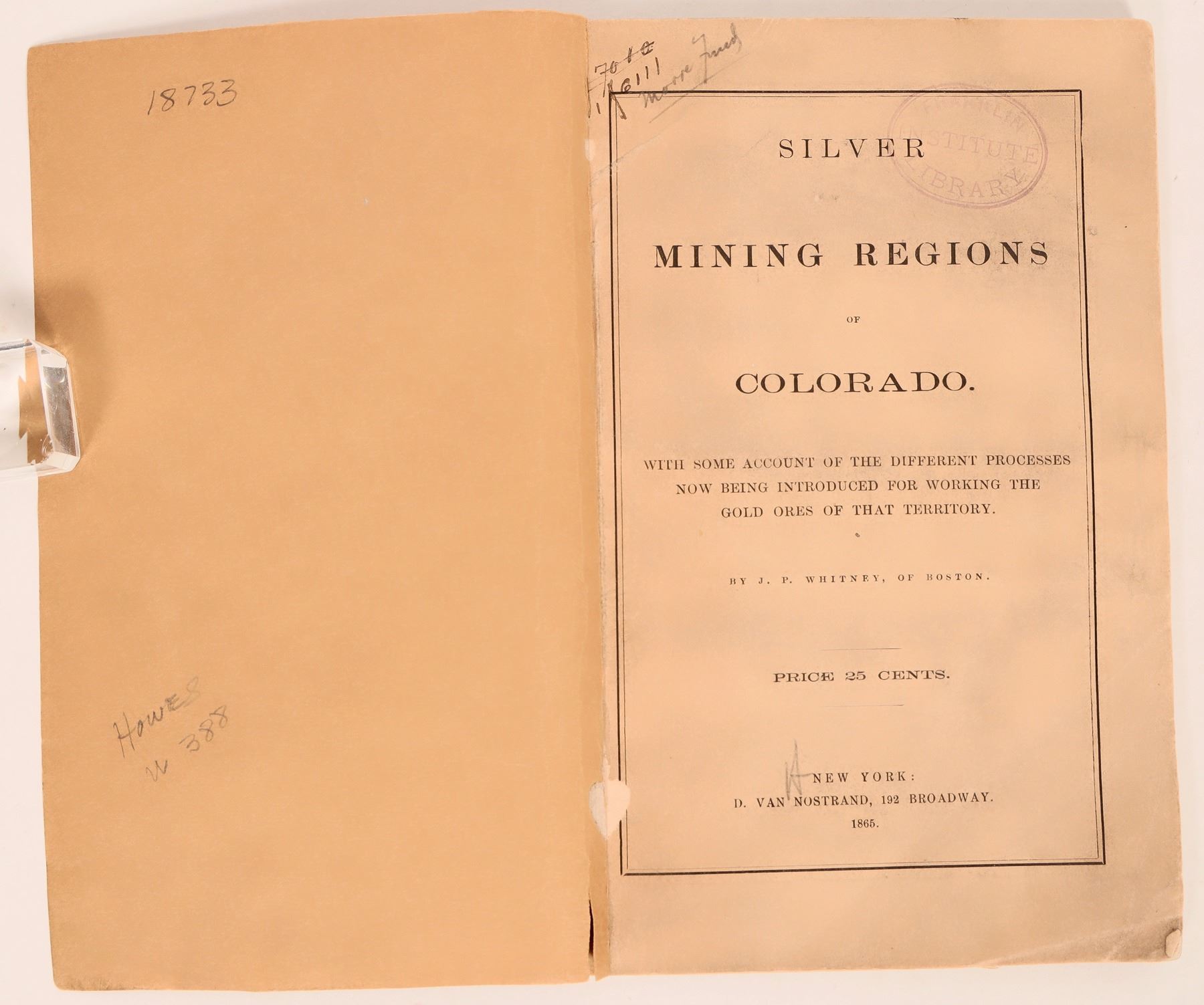 Silver Mining Regions of Colorado by J.P. Whitney 1865. The preface claims that while the book (Or pamphlet) was hastily written, its aim was more meant to attract Capitalists to the region. The book has a replacement cover, it is still in nice condition. The book is 107 pages and EXTREMELY RARE. Please see photos for more details.