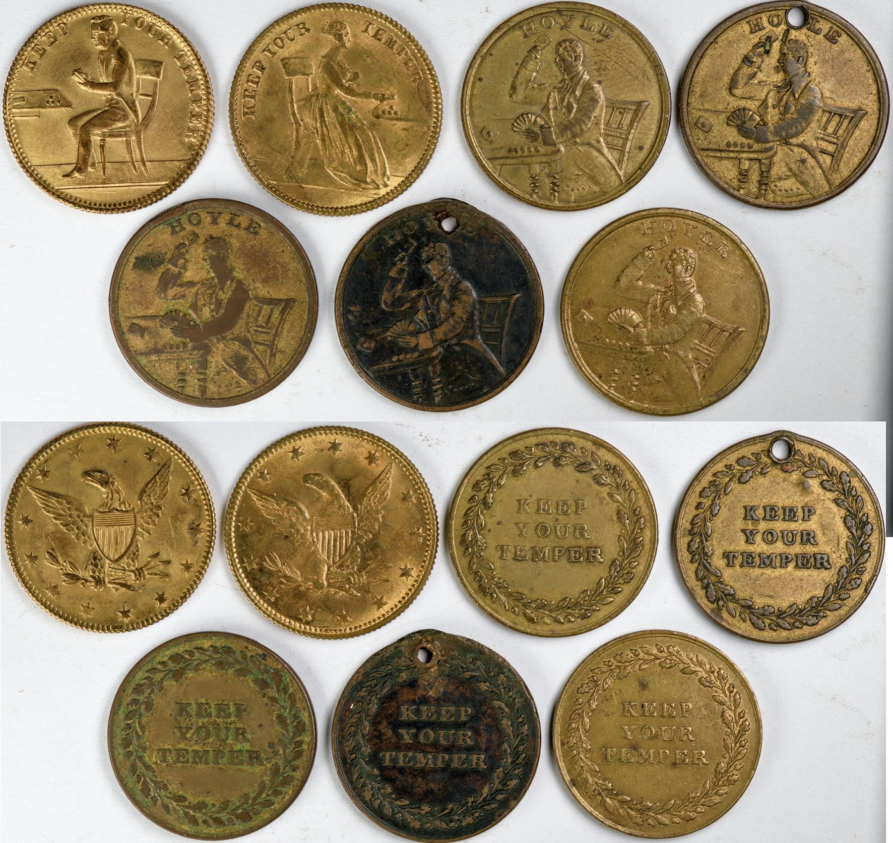 Lot of 7. 1. Five Hoyle “The Card Man” counters. Man seated obverse, KYT reverse. 2. Two sepeerate KYT Tokens one woman and one man seated Facing each other obverse, reverse Eagle.