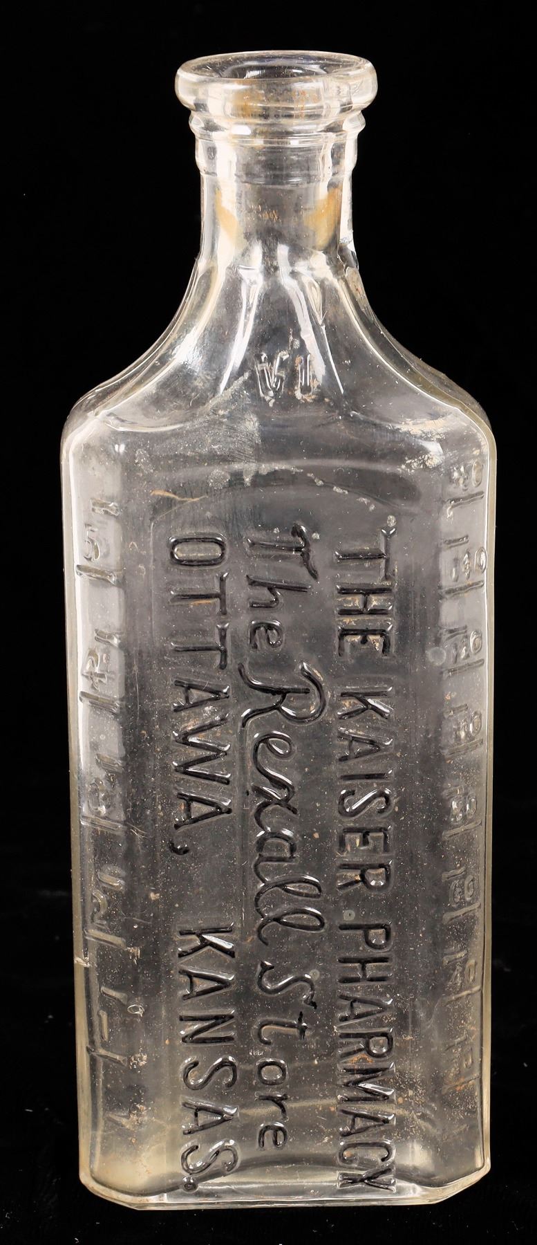 Black embossed The Kaiser Pharmacy/Ottawa, Kansas. 6.5". No apparent chips or cracks. Iowa Ottawa Gary Bracken Collection