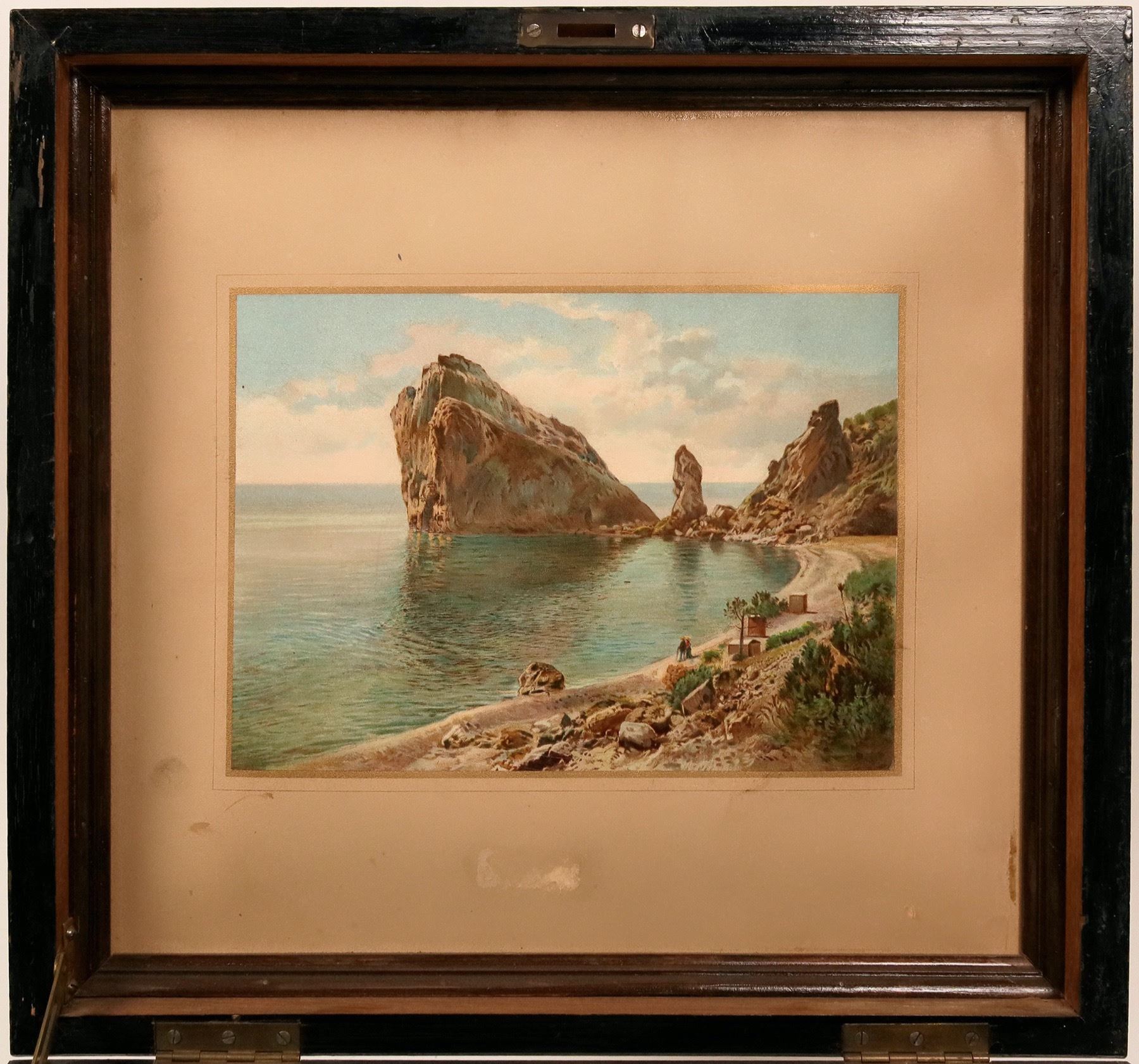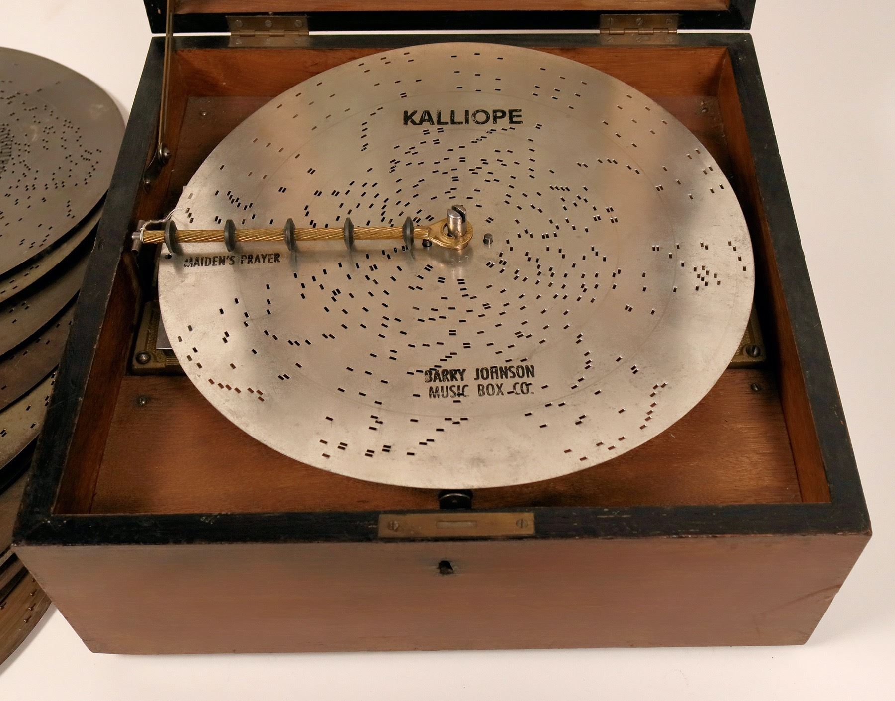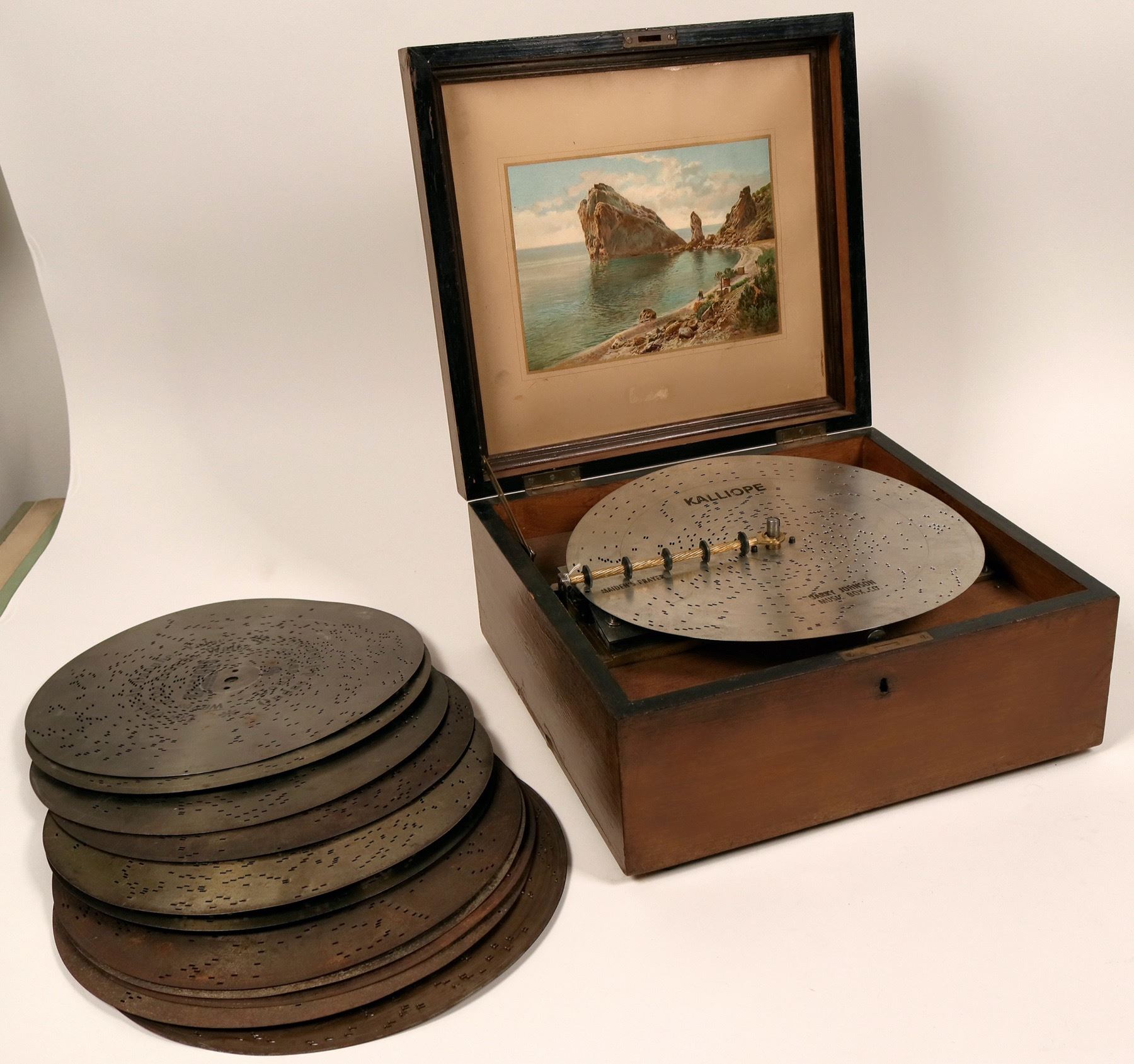 This is a Kalliope music box (of Leipzig, Germany) with 13 inch discs. This table model has a center post that acts as the winding post and may well be referred to as the movie model. There are 12 discs in all. Most are labeled in German. One disc is the "Maiden's Prayer" made by the Barry Johnson Music Box Co. The box is in working order, however the winding crank is missing. One must be made by a hobby craftsman or millwright. There is a lever on the side which lets the box run continually or stops after one play of the song. A beautiful vignette of a beach scene is on the inside cover. The box and mechanism is original but the rubber pad legs are replacements. Extra shipping charges may apply. Please see photos for more details.
