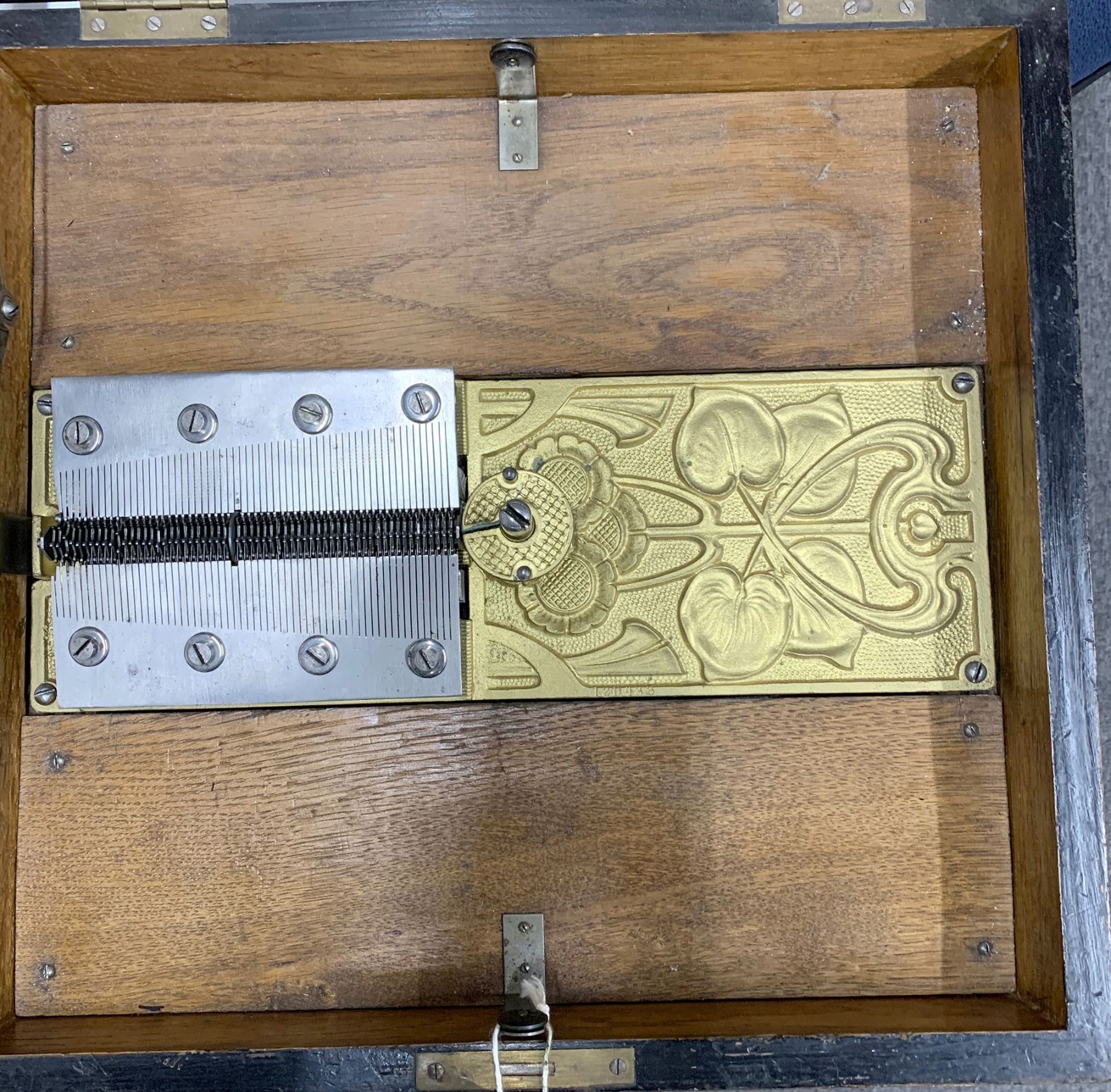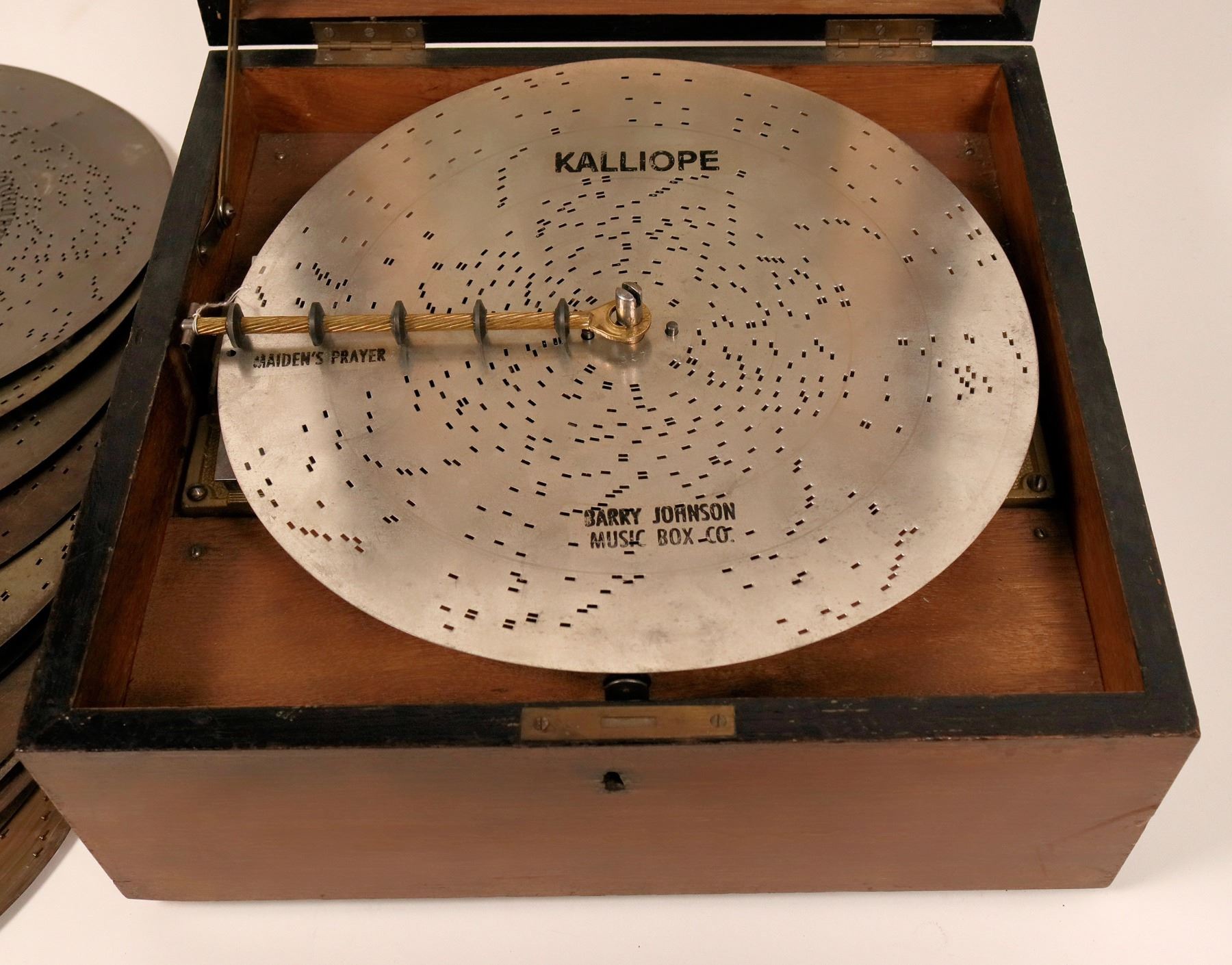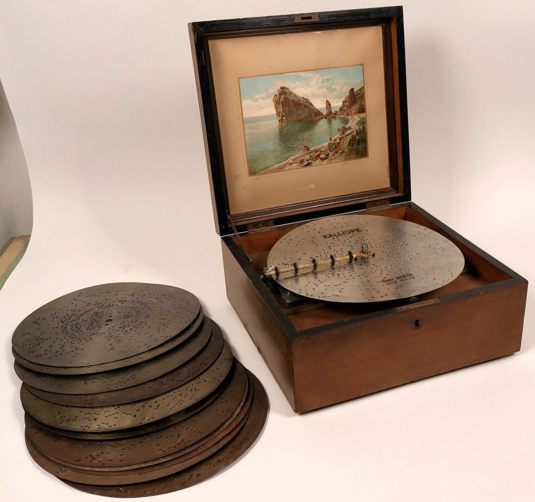 This is a Kalliope music box (of Leipzig, Germany) with 13 inch discs. This table model has a center post that acts as the winding post and may well be referred to as the movie model. There are 12 discs in all. Most are labeled in German. One disc is the "Maiden's Prayer" made by the Barry Johnson Music Box Co. The box is in working order with the winding handle. There is a lever on the side which lets the box run continually or stops after one play of the song. A beautiful vignette of a beach scene is on the inside cover. The box and mechanism is original but the rubber pad legs are replacements. Extra shipping charges may apply. Please see photos for more details.