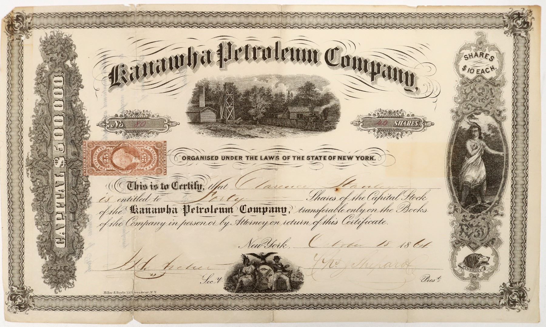A stock certificate for 40 shares in the Kanawha Petroleum Company, dated 1864. The certificate is made out to Clarence Harley, and is signed by the secretary and president of the company. It has been stamped with the official seal of the company, and features three beautiful engraved vignettes. It is torn along its creases, but fully intact. A 25¢ stamp is attached to the certificate. According to a June 1865 Pittsburgh article, the company had property at Stephens Farm, Thirteen-Mile Creek, Easton County, West Virginia.