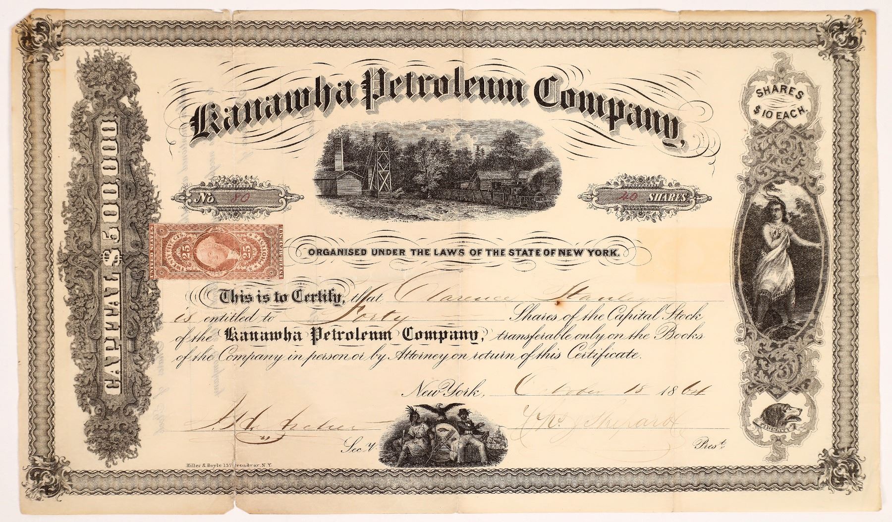 Organized under the laws of New York. No. 80, issued for 40 shares to Clarence Stanley in 1864 in New York. Signed by president Shepard and the secretary. Not cancelled. Black border and print. Three vignettes: two allegorical and oil derrick. 25 cent US IR Protest stamp attached on the left. Printed by Miller & Boyle, NY. Folds with separation, toning, wear to borders. 7 x 12" According to a June 1865 Pittsburgh article, the company had property at Stephens Farm, Thirteen-Mile Creek, Easton County, West Virginia.