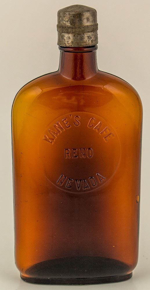 Kane's Café Reno Nevada. Amber embossed pint whiskey. Screw top with original, appears sparkling mint. Thought to be only two or three known. This bottle probably dates from the opening of Kane's Cafe in 1912. It was run by William J. Kane, and remained open past 1921. See Holabird volume one, pp 213 to 214. City: Reno State: Nevada Inventory Number: 39507