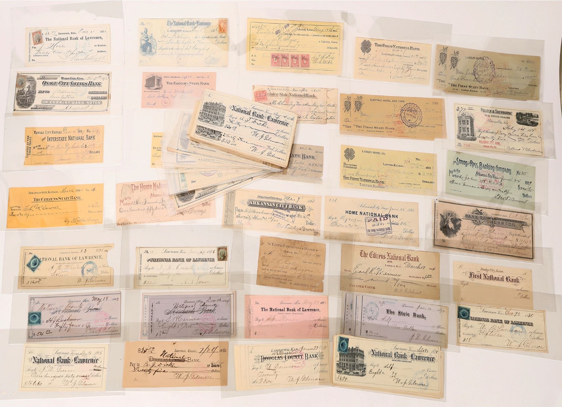 About 60 Kansas checks c. 1866-1932. Osage City, Lawrence, Galesburg, Hays City, Kansas City, La Crosse, Larned, Arkansas City etc.