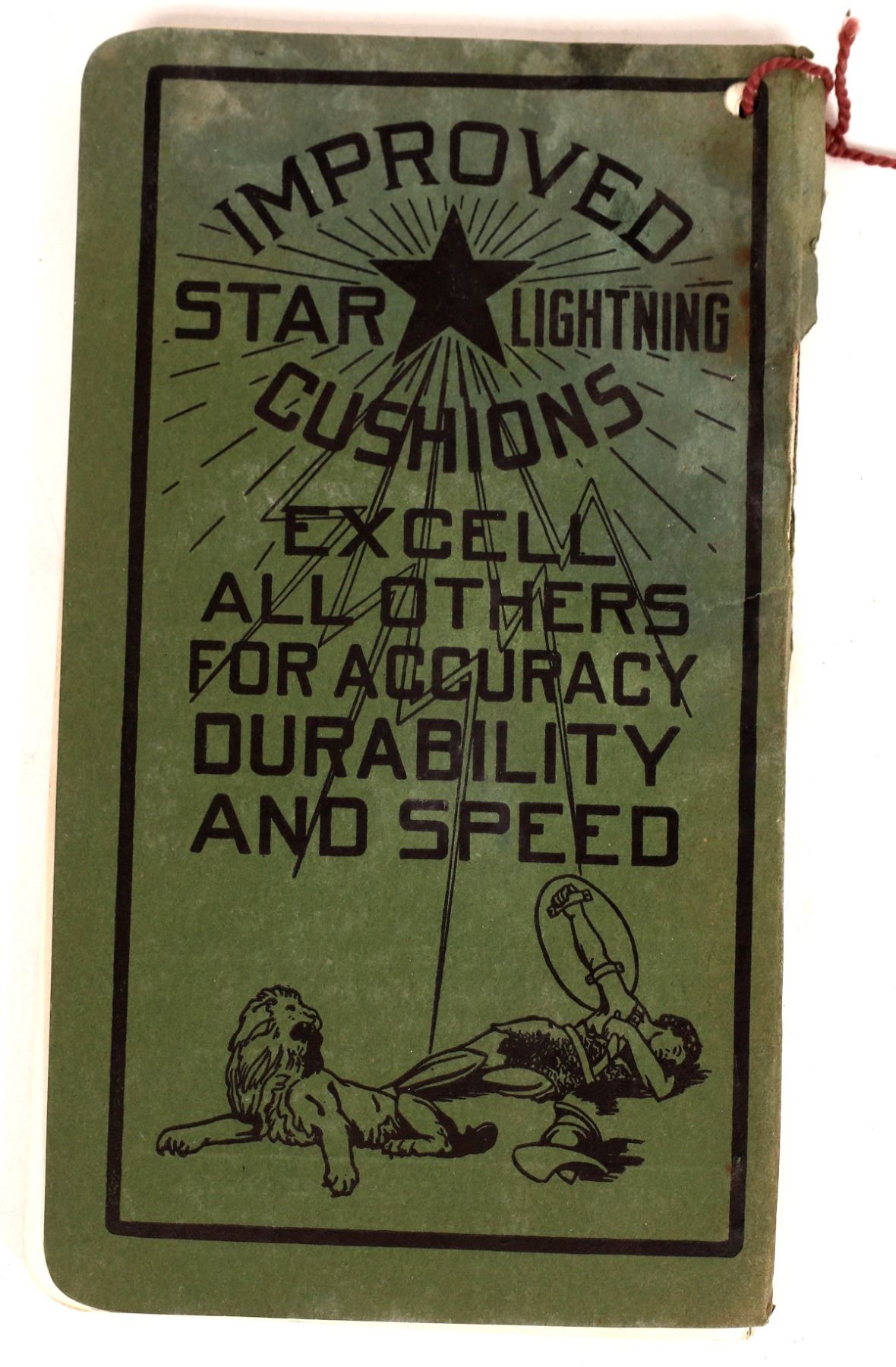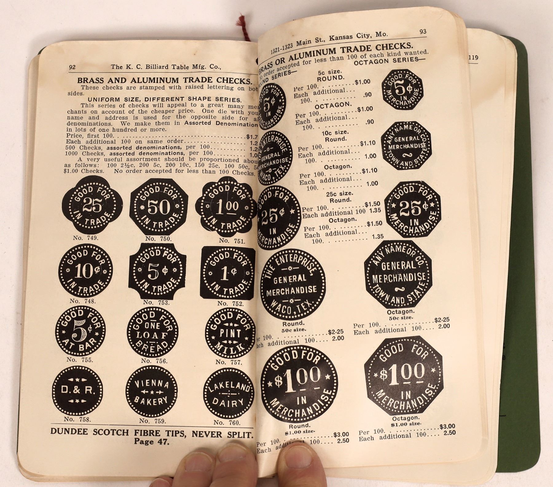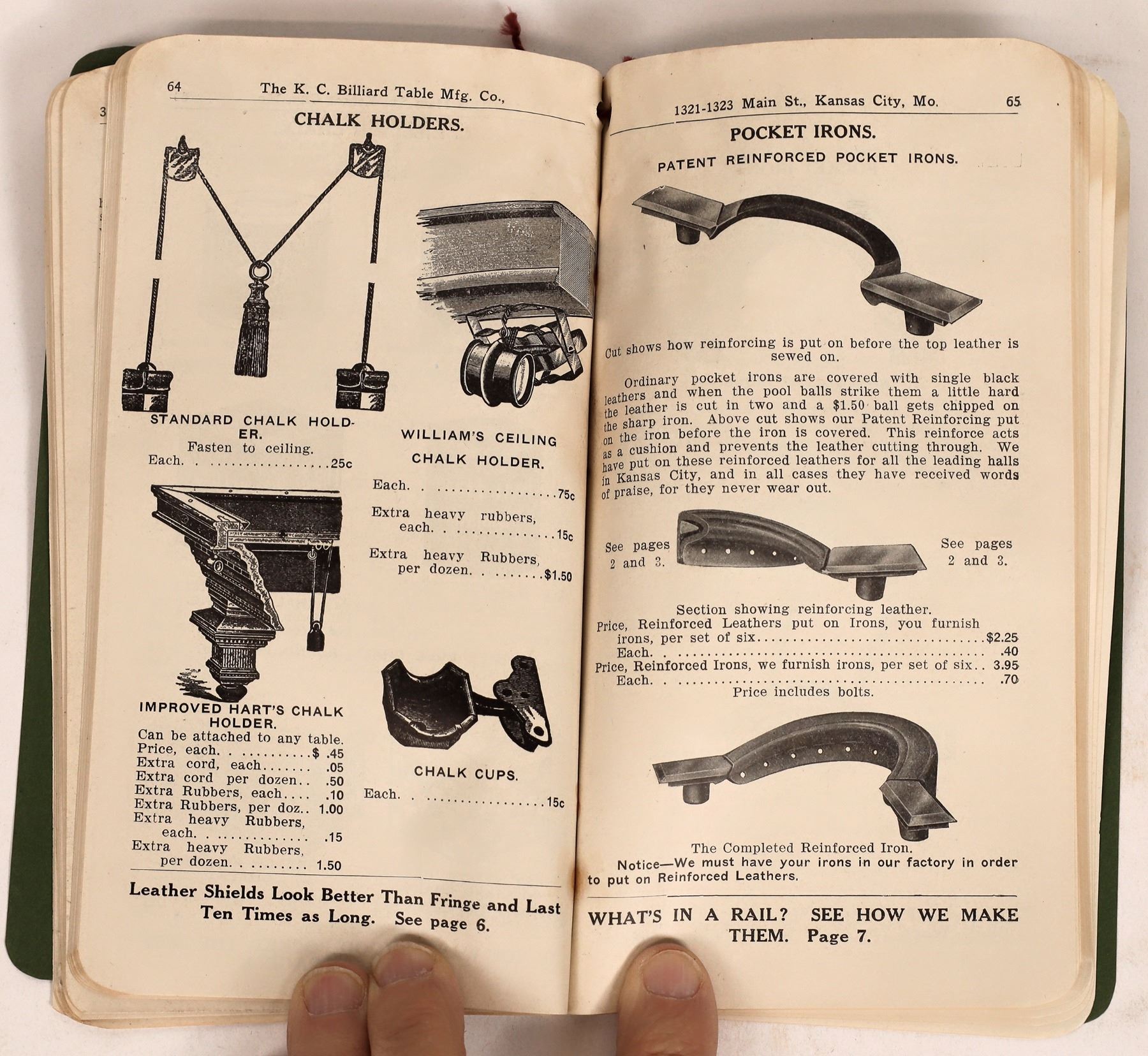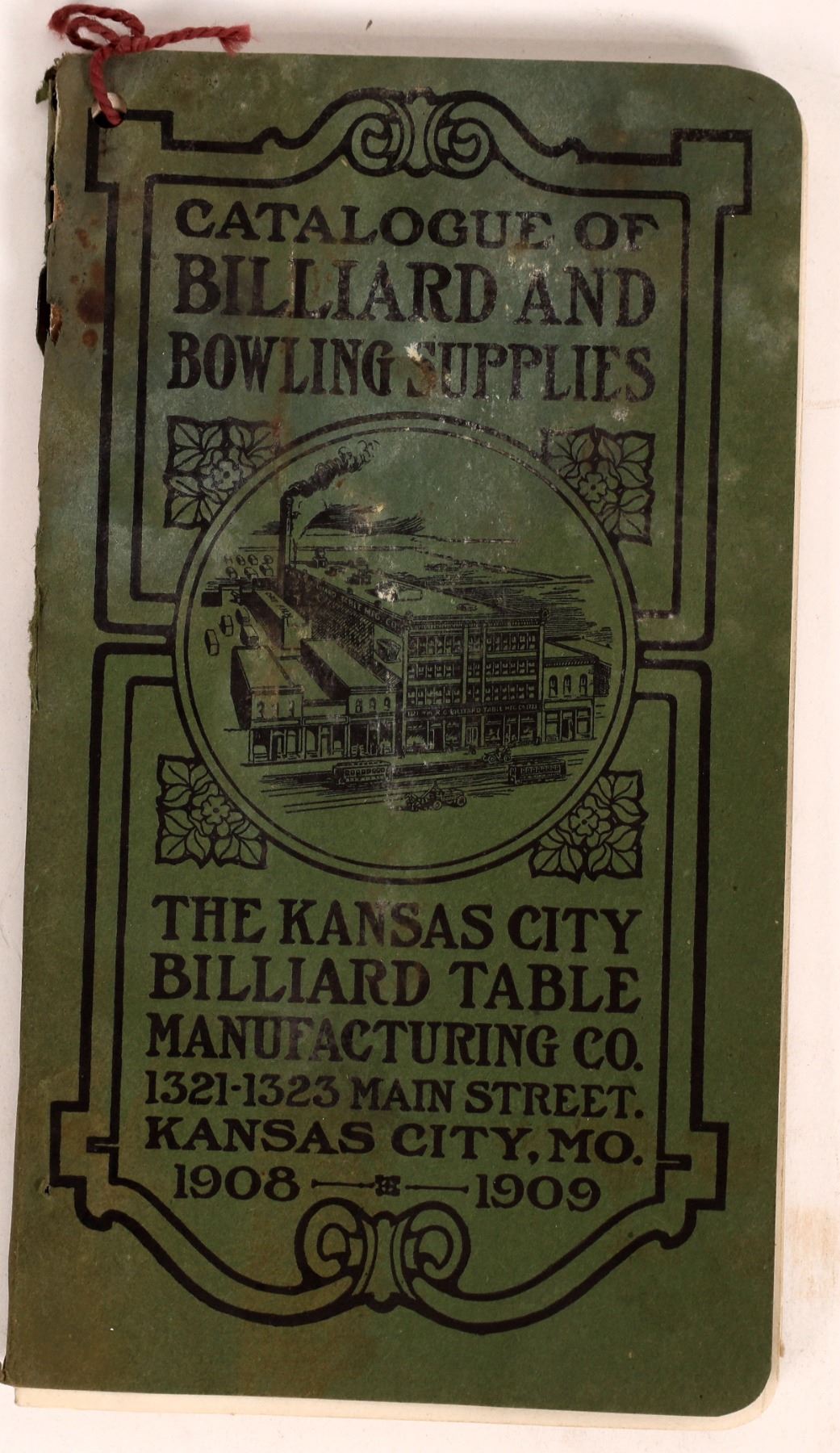 1908-09 rare Kansas City Billiard Table catalog of billiard table parts, tokens and chairs etc. 124pp with index. 8x4.5". Spine detaching, staple rust, light staining etc. Please inspect.