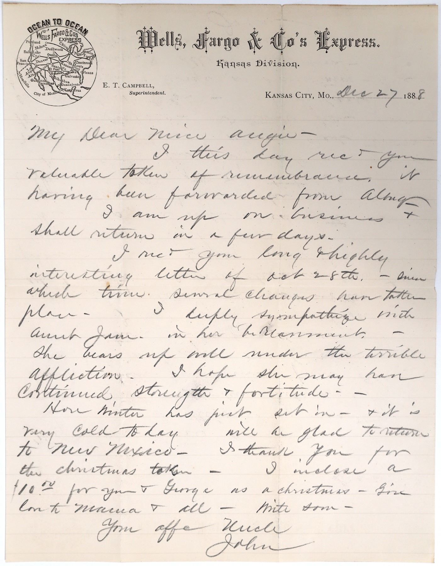 1888. Map of Wells Fargo from Ocean to Ocean. ET Campbell superintendent Kansas Division. Sent by Uncle John to niece Angie. He will be back in New Mexico soon!