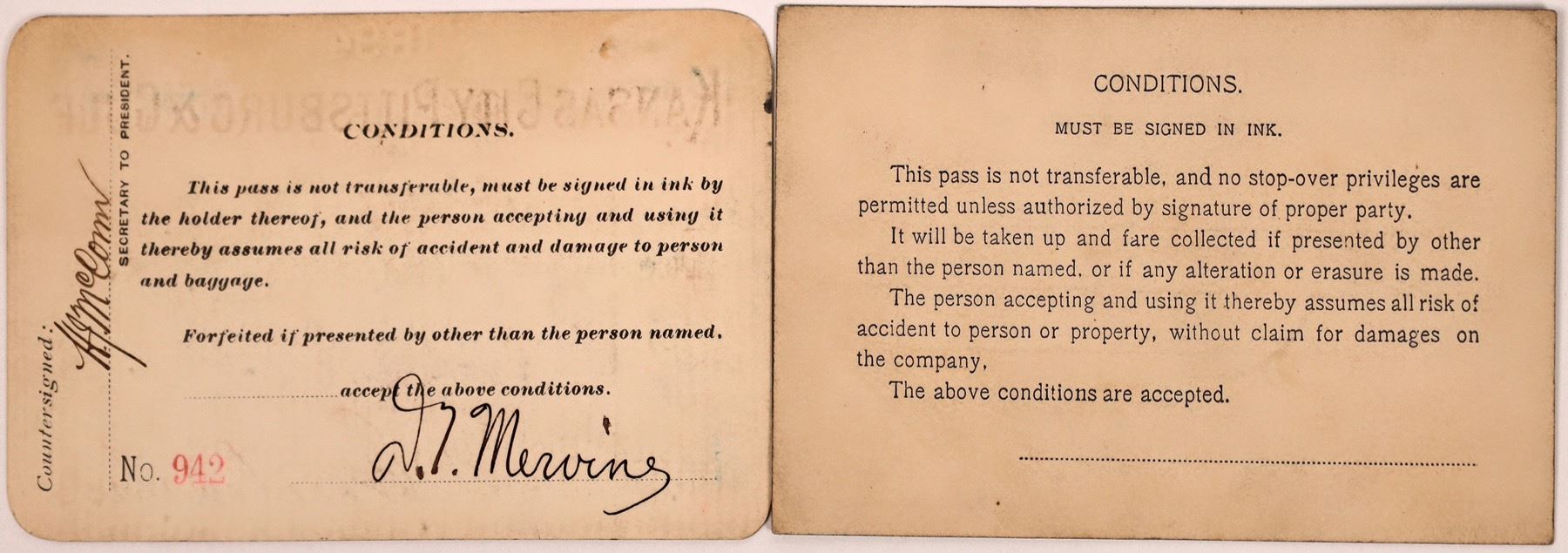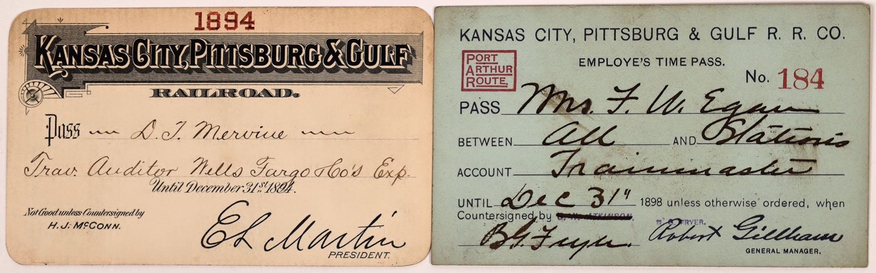 2 Kansas City, Pittsburg & Gulf RR Passes 1894/1898. The 1894 pass is signed by the president and numbered 942 on reverse. The 1898 pass is an Employee's Time Pass on the Port Arthur Route