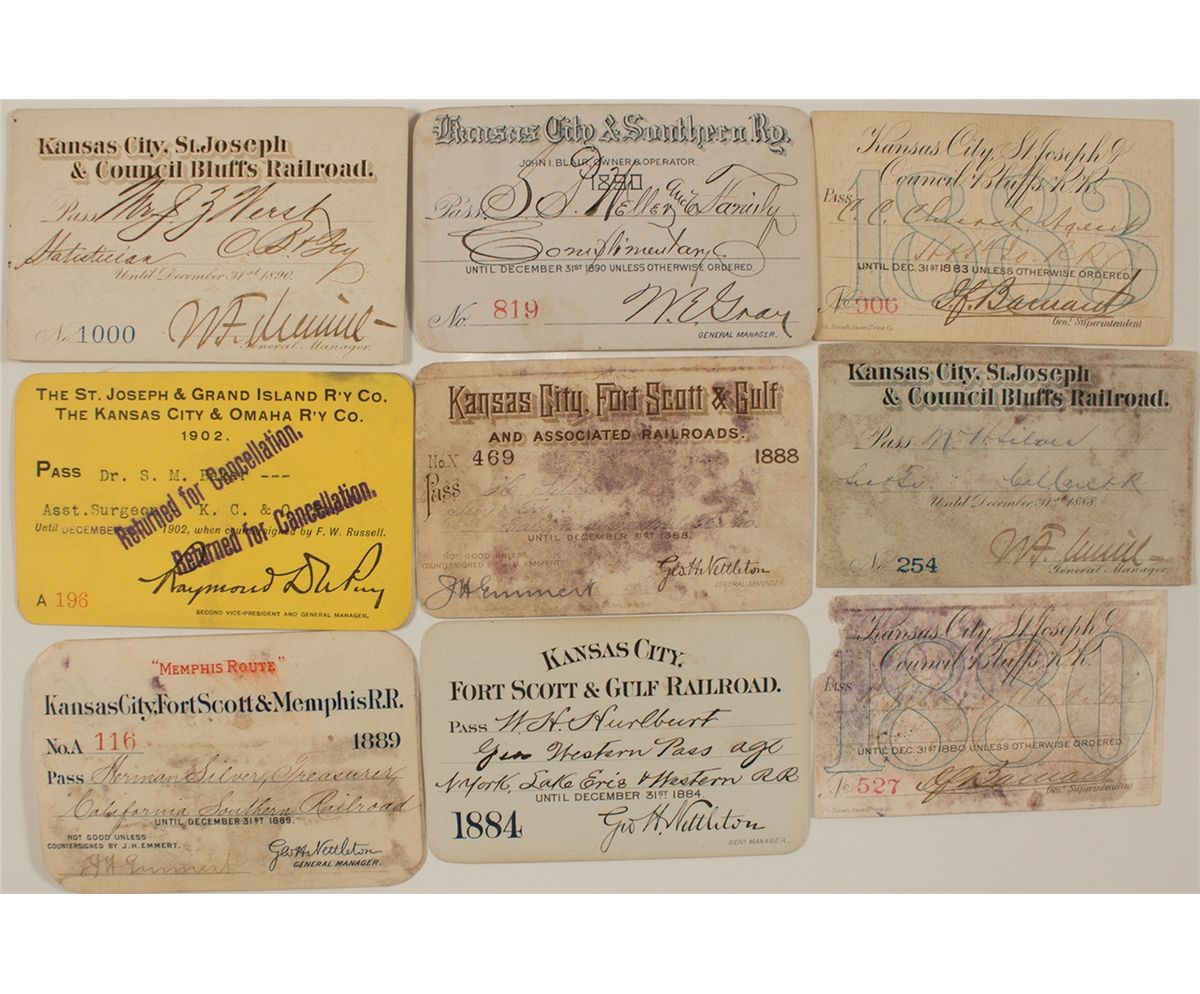 Nine passes total: Kansas City & Southern Railway (1890); The Kansas City & Omaha Railway Co. (1902); Kansas City, St. Joseph & Council Bluffs Rail Road (1883, 1880, 1888, and 1890); Kansas City, Fort Scott & Gulf Railroad (1884, 1888, and 1889). Prag Collection