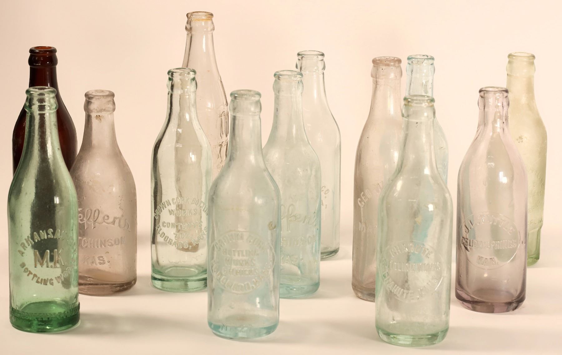 Lucky thirteen. One ultra rare (some surface damage, but no big chips), and two rare Arkansas City bottles. All rated scarce in Fletcher and one modern crown. Includes an MK Arkansas City embossed, two Stephens Hutchinson (embossed), JL Tuttle Geuda Springs, Chanute Bottling Works, two Crown Cork Bottling Works at El Dorado embossed, Star Bottling Salina, and Mathis & Co Augustus embossed.