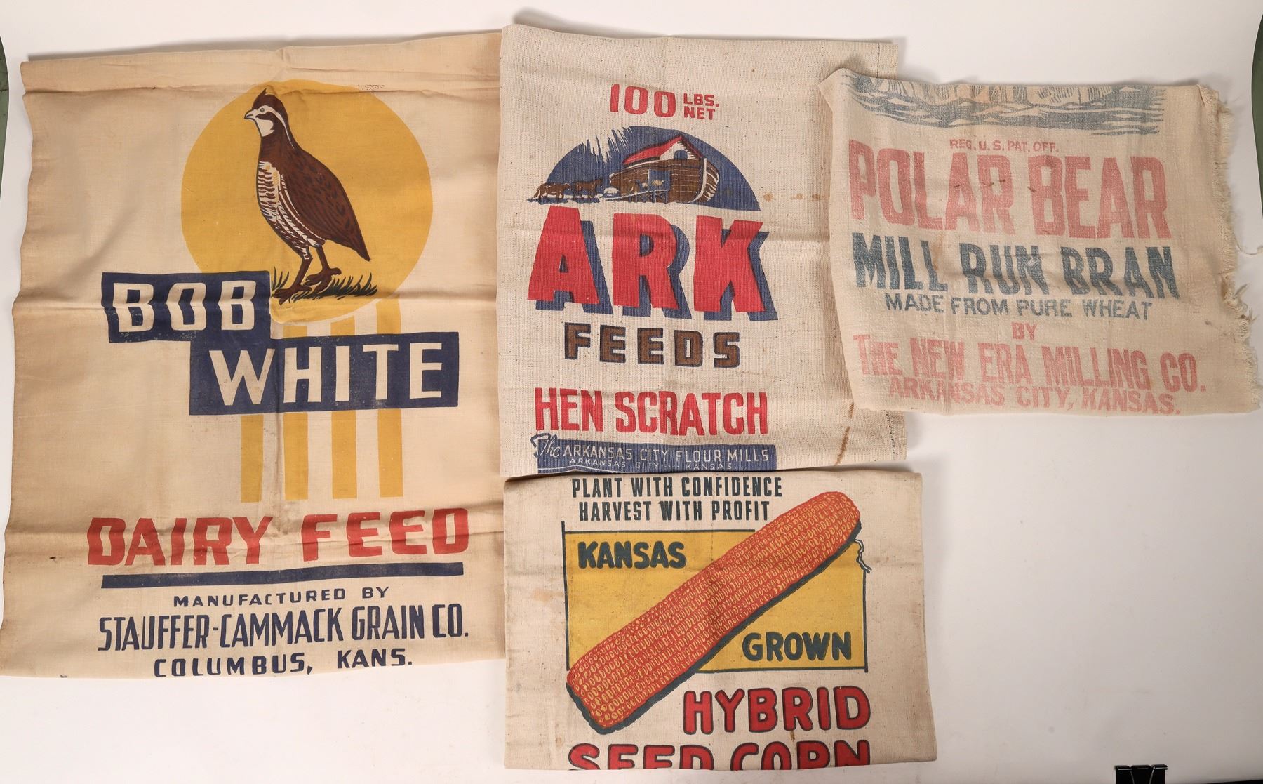 Grain and feed sacks from Kansas mills. Brands include Polar Bear, RF Brand Hybrid Seed Corn, Bob White Dairy Feed and Ark Hen Scratch. They all measure approximately 17"x 40" and are still brightly lettered. Please see photos for more details. Kansas Columbus 1920s