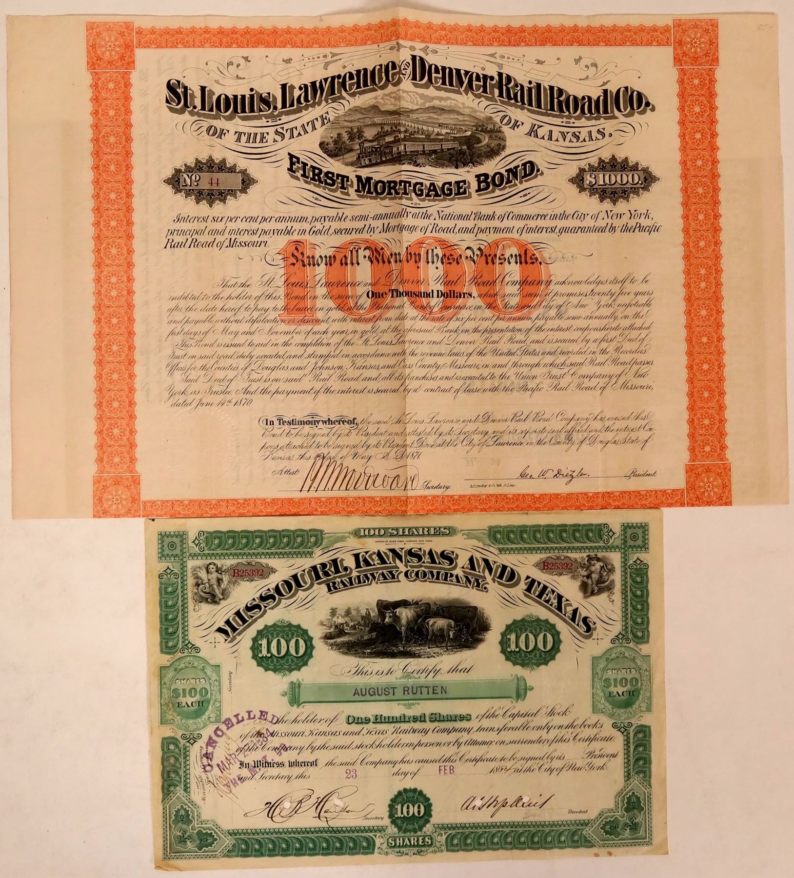 2 certificates. 1. St. Louis, Lawrence & Denver Rail Road Co State of Kansas , incorp 1865-1874. #44, I/U, $1000 6% First Mortgage gold bearer bond issued May 1, 1874 signed Geo. W. Dietzler President. Orange, embossed seal, vignette 4-40 r-l rounding curve. 1000 orange underprint, coupons 12-50 attached. Not in Cox, only I/C listed (Cox 2018). B.P. Stadley & Co printer. EF. 2. Missouri, Kansas, and Texas Railway Co. (M-K-T or Katy), the first railroad to enter Texas from the north, began its corporate existence in 1865, when its earliest predecessor, the Union Pacific Railway Company, Southern Branch, was chartered by the State of Kansas . Ran until 1923 and became the Missouri, Kansas and Texas Railroad. #B25392, I/C, 100 shares @ $100 ea. issued Feb 23, 1884. Green, no seal, vignette cows grazing, American Bank Note Co. VF