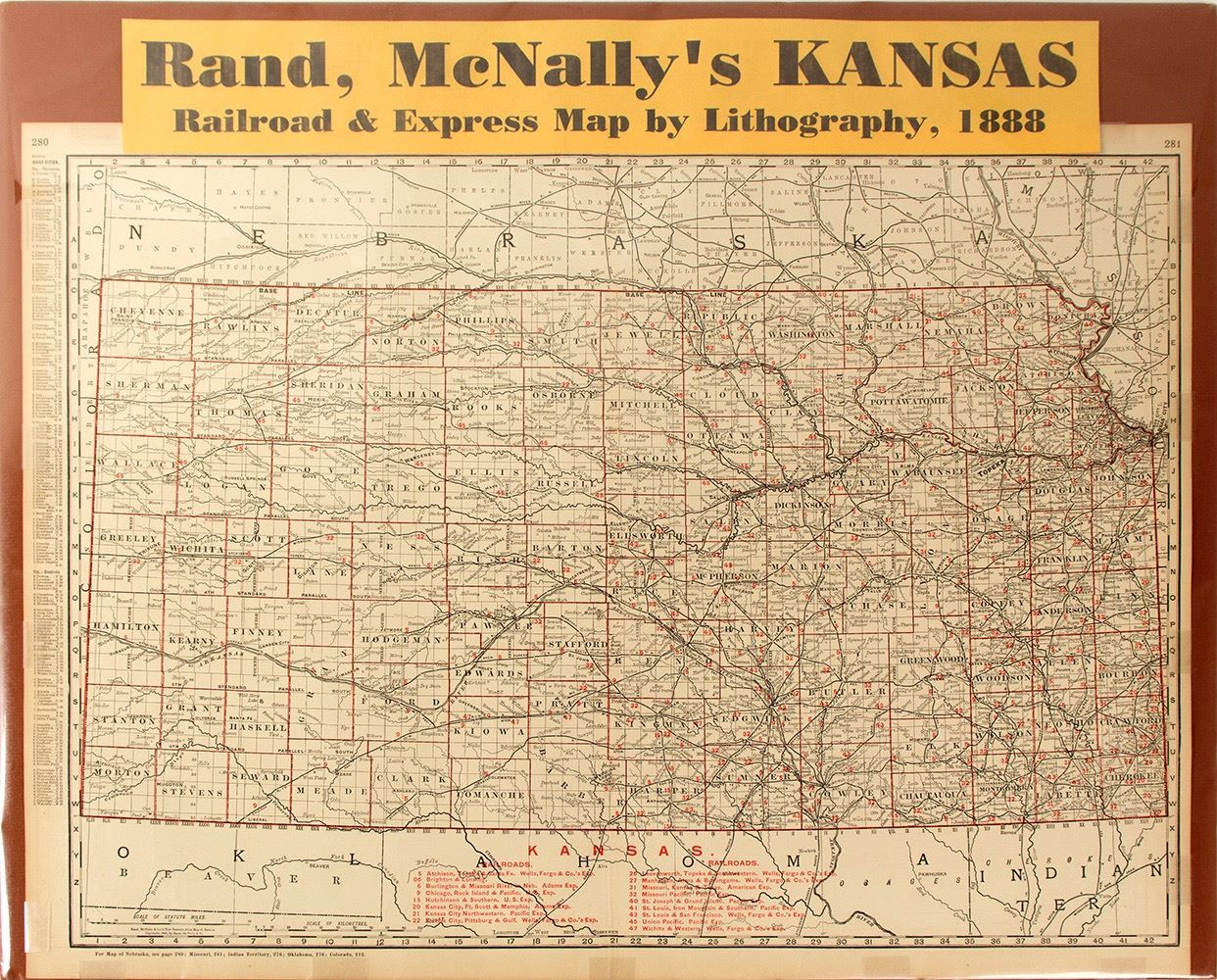 Double Truck, hand color, pp. 280 & 281, of Railroad & Express map by Lithography. Good condition. On Mat Board (not adhered) with plastic covers. If mats are shipped then additional shipping may apply. 27.25" x 20.5". (Potter Collection) Date: 1888 Location: Kansas HWAC# 59335