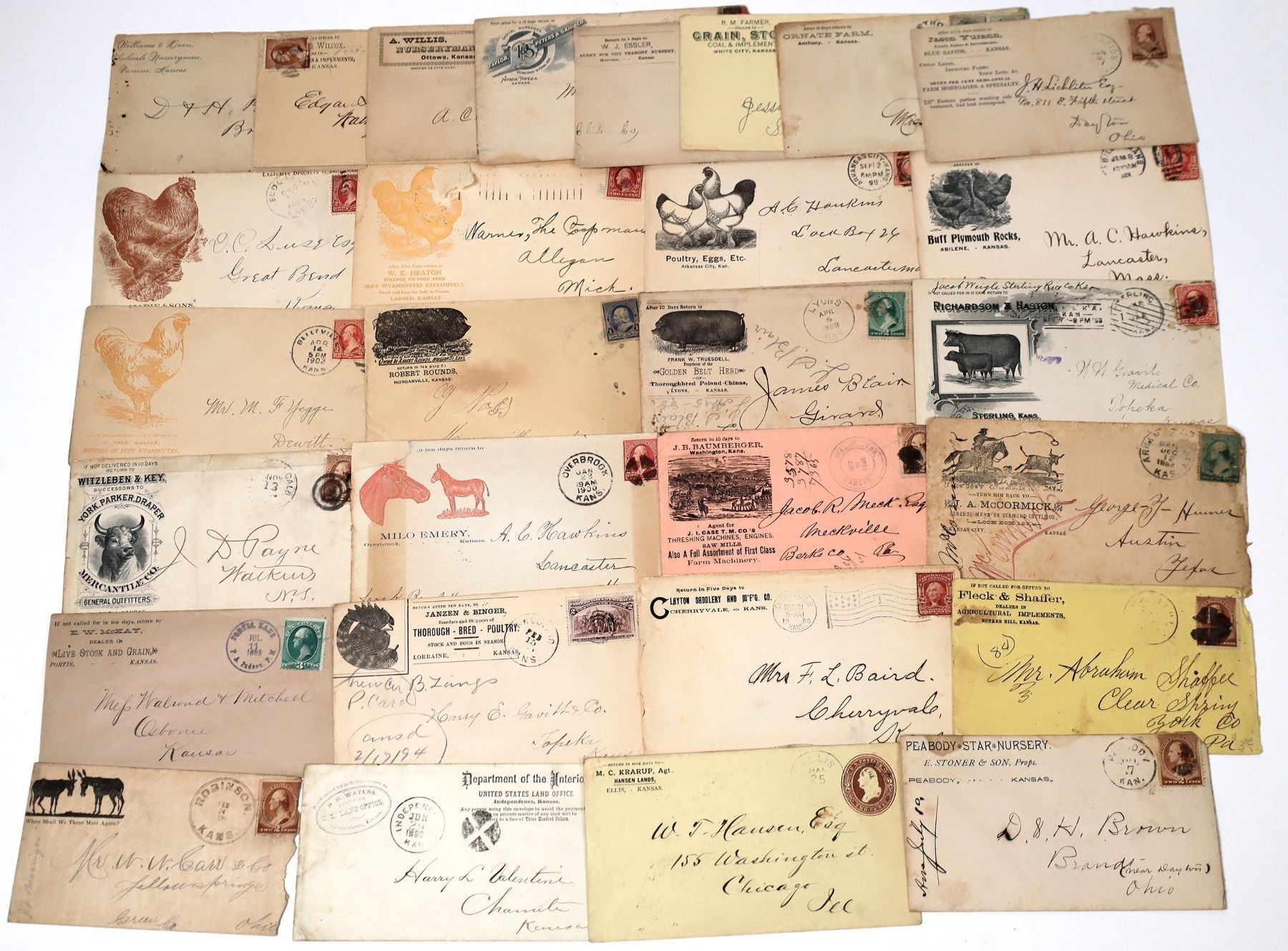 Lot of twenty-eight. Fourteen pictorials: 1888 Arkansas City , Diamond Cattle Co. with lasso vignette. Baumberger farm machinery with very nice vignette. 1886 strong double ring/double circle. Horse and donkey vignettes from Milo Emery of Overbrook. Cattle vignette for York, Parker and Draper of Caldwell. Early postmark. Richardson & Hastings cattle vignette for Sterling. 1898. Lyon & Morganville hog vignettes. Rooster vignettes (color and large underprints included ) from Belleville, Abilene, Arkansas City, El Dorado, City Larned (damaged). Other advertising pieces include Lorraine, Cherryvale Clayson Saddlery, Bunker Hill Fleck & Shaffer, Blue Rapids improved farms, Anthony Ornate Farm, White City Farmer grain & stock, Mulvane nursery, etc. A prize piece is the Portis postmark from 1883. The post office here opened in 1881! McKay livestock & grain. Most covers are 1870-1905. See photo for all covers and condition.