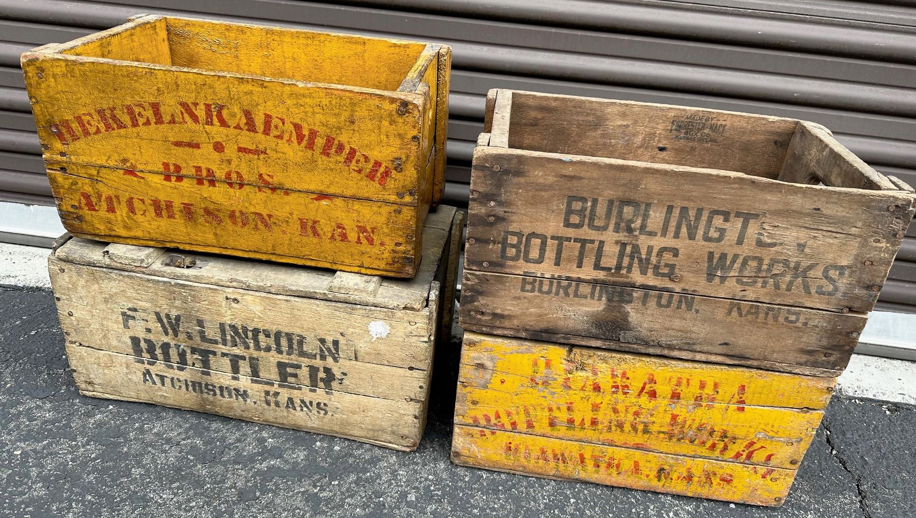 Four original vintage divided (for 24 bottles) wood boxes for beer or soda bottles. All of htese merchants have embossed nottles! The merchants: Hekelnkemper Bros, Atchinson, KS (embossed bottles known); F.W. Lincoln Bro, Atchinson, KS (emb bottles known); Burlington Bottling Works, Burlington KS (emb bottles known); Hiawatha Bottling Works, Hiawatha, KS (emb bottles known). Approximately 9" x 17" x 11" See Johnnie Flether's book for info on the companies. Bracken Collection. Kansas