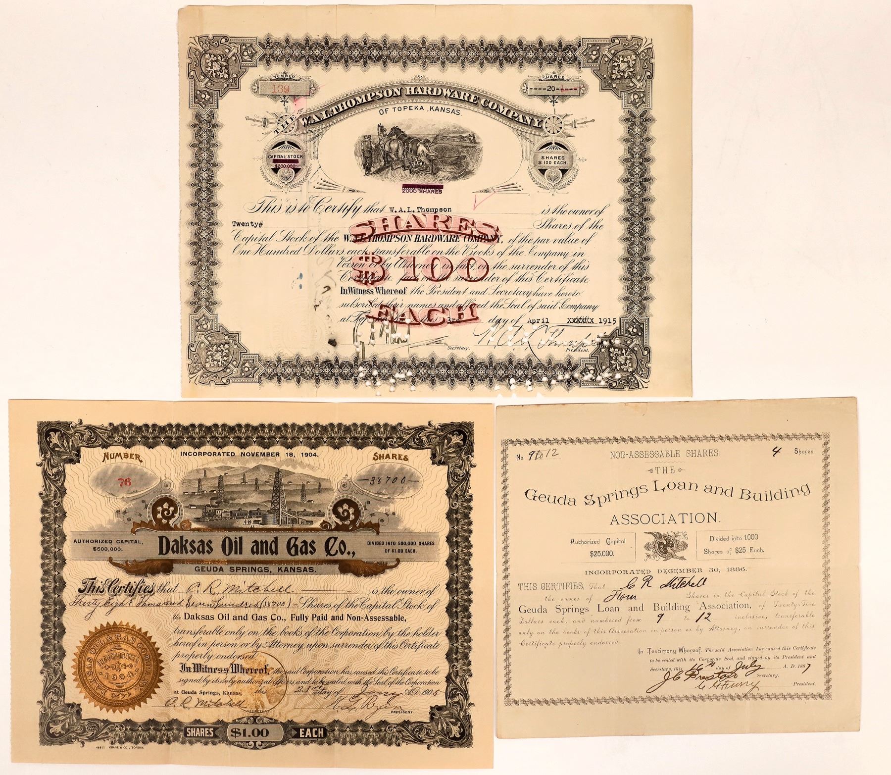 Lot of 3 different. 1) Daksas Oil and Gas Company. Geuda Springs, Kansas. Issued in 1905 to the secretary for 38,700 shares. Also signed by president HL Ryan. Not cancelled. Black border and print, gold seal, and oil derrick vignette. 2) W.A.L. Thompson Hardware Company of Topeka, Kansas. Issued to WAL Thompson in 1915 (typed over 1880s dateline). Punch cancelled. Farming vignette. 3) Geuda Springs Loan and Building Association. Issued in 1887, not cancelled. Please inspect.