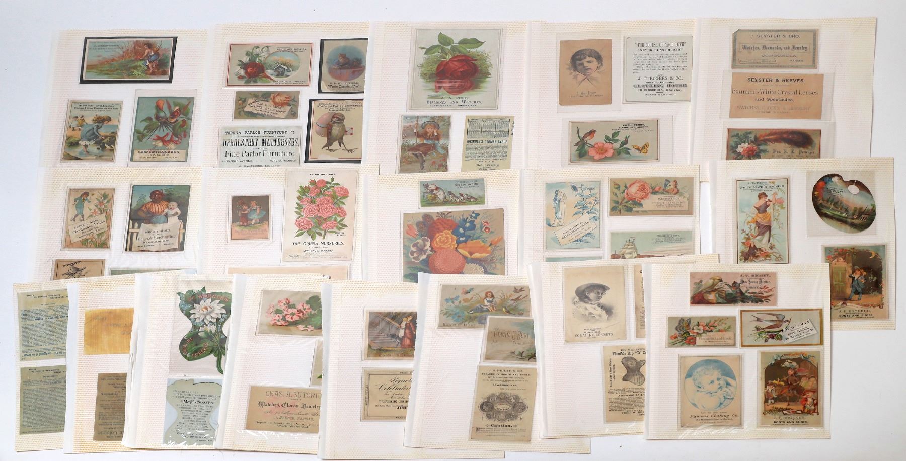 Collection of about 150 trade cards from businesses in Kansas. These trade cards advertise many different goods including hardware, perfume, groceries, flowers, shoes, sewing machines, baking powder, clothing, stoves, seeds, etc. Various sizes, all are in protective sleeves that are pasted onto album pages that are 9 x 11 inches. Good condition.