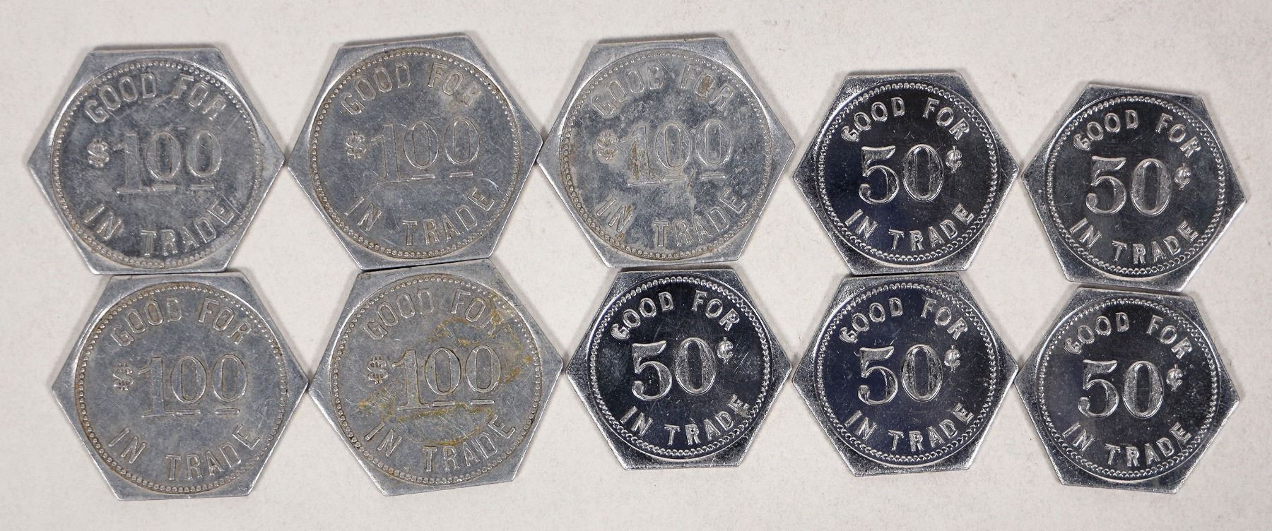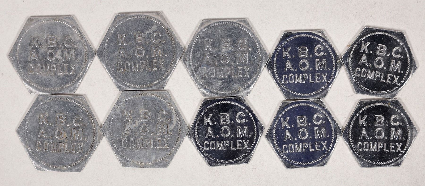 Ten aluminum tokens from the Kanto Base Command Airmen's Open Mess in Japan. All are hexagonal and have K. B. C. / A. O. M. / Complex on obverse. Five are: Good For / 50c / In Trade (28 mm); five are Good For / $1.00 / In Trade (32 mm). The world's largest overseas U.S. naval base, located on the Miura Peninsula in the Kanto Plain region of Japan. Home to the U.S. Navy's Seventh Fleet and considered one of the most strategically important bases in the U.S. military.