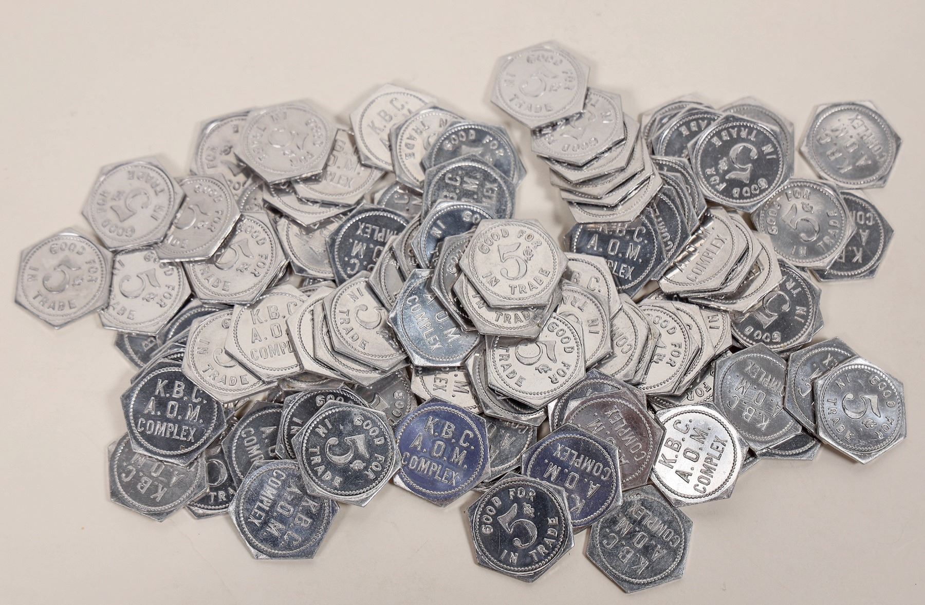 Brilliant uncirculated hexagonal tokens: K. B. C. / A. O. M. / Complex // Good For / 5c / In Trade; Al., hex., 20 mm. Cunningham2#JP2120a.