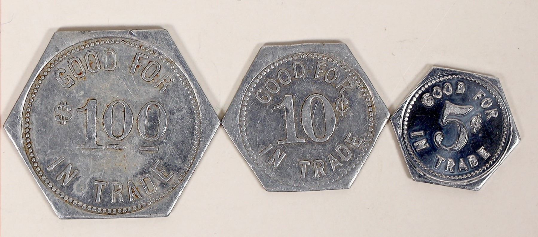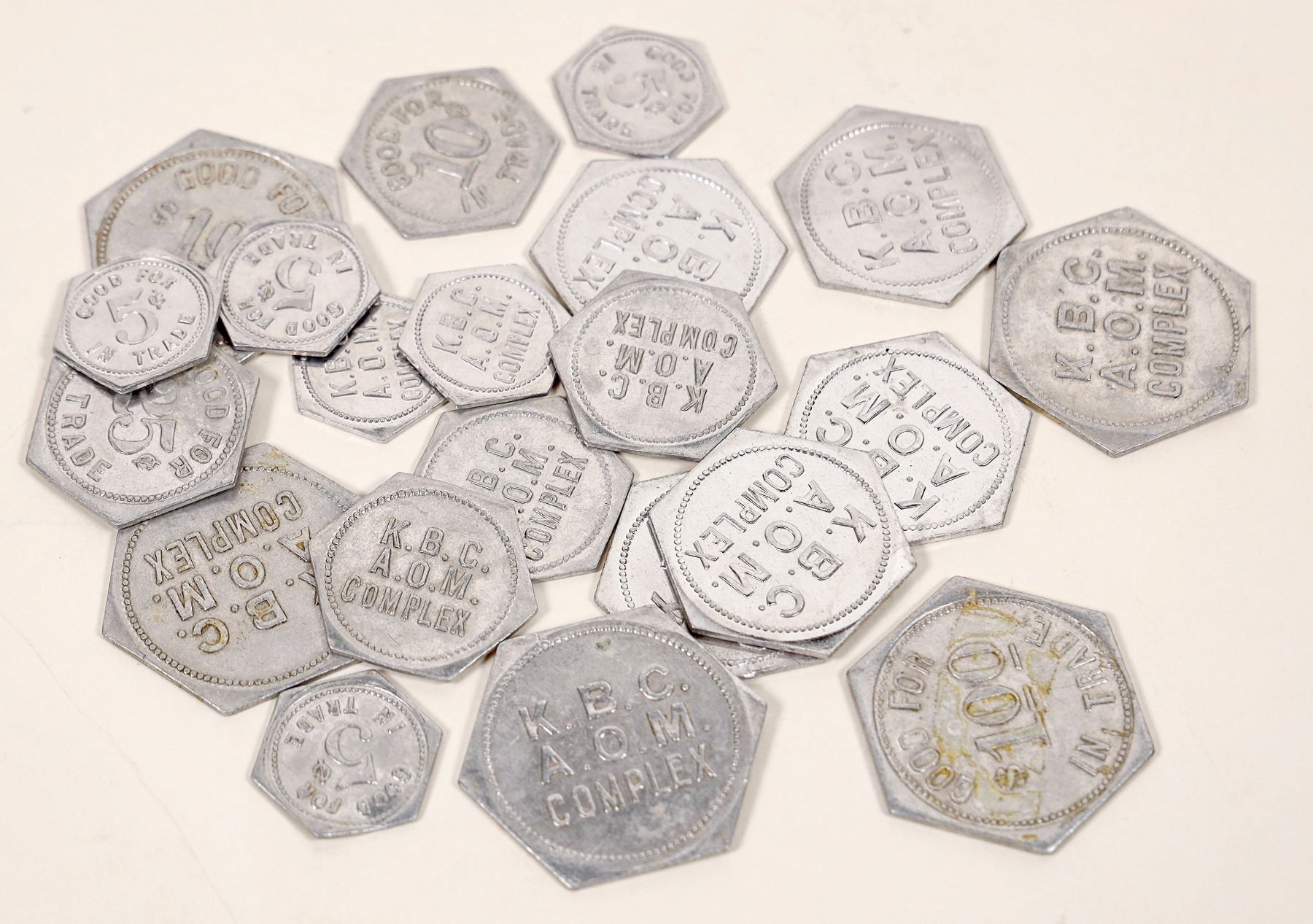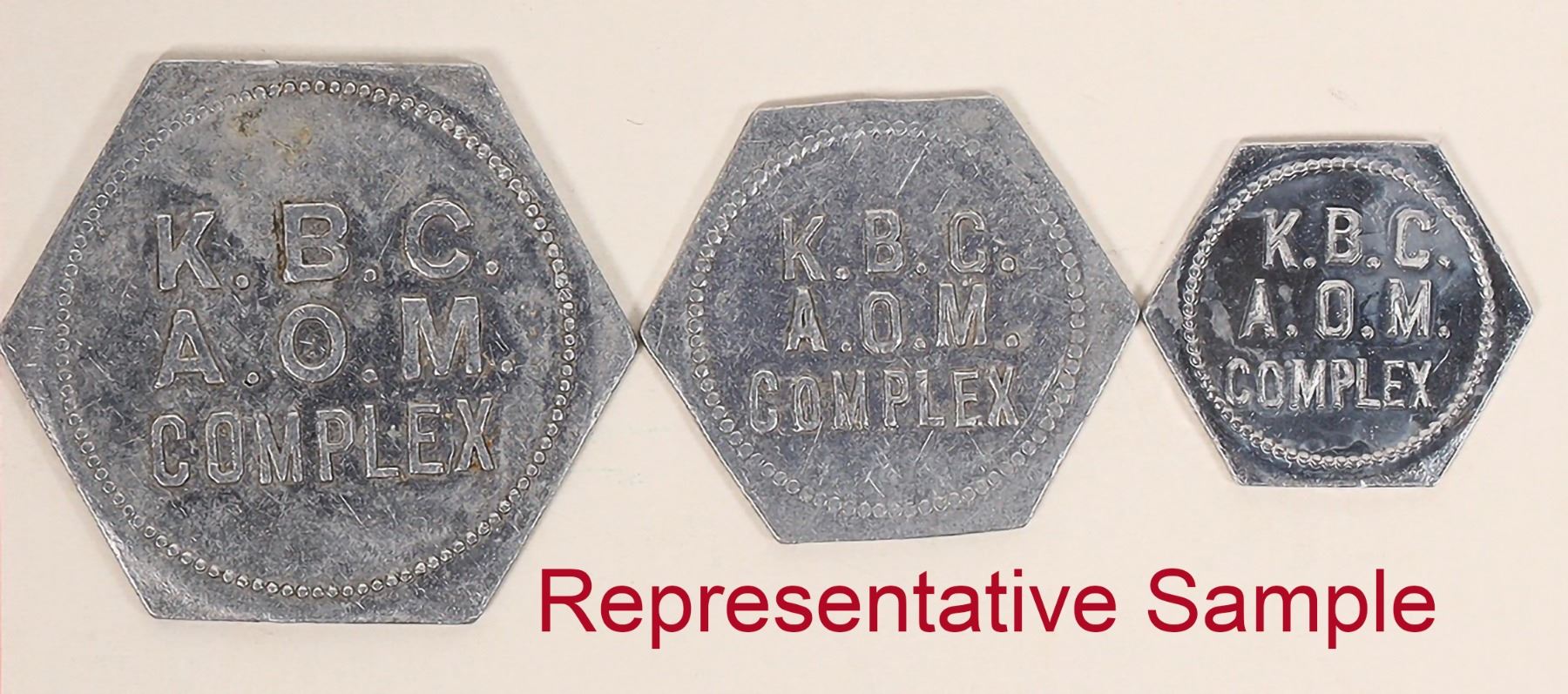 Five different denominations: K. B. C. / A. O. M. / Complex // Good For / 5c (5), 10c (40, 25c (1), 50c (5), $1 (5). Kanto Base Command, 28 miles northwest of Tokyo, is home to several naval bases.