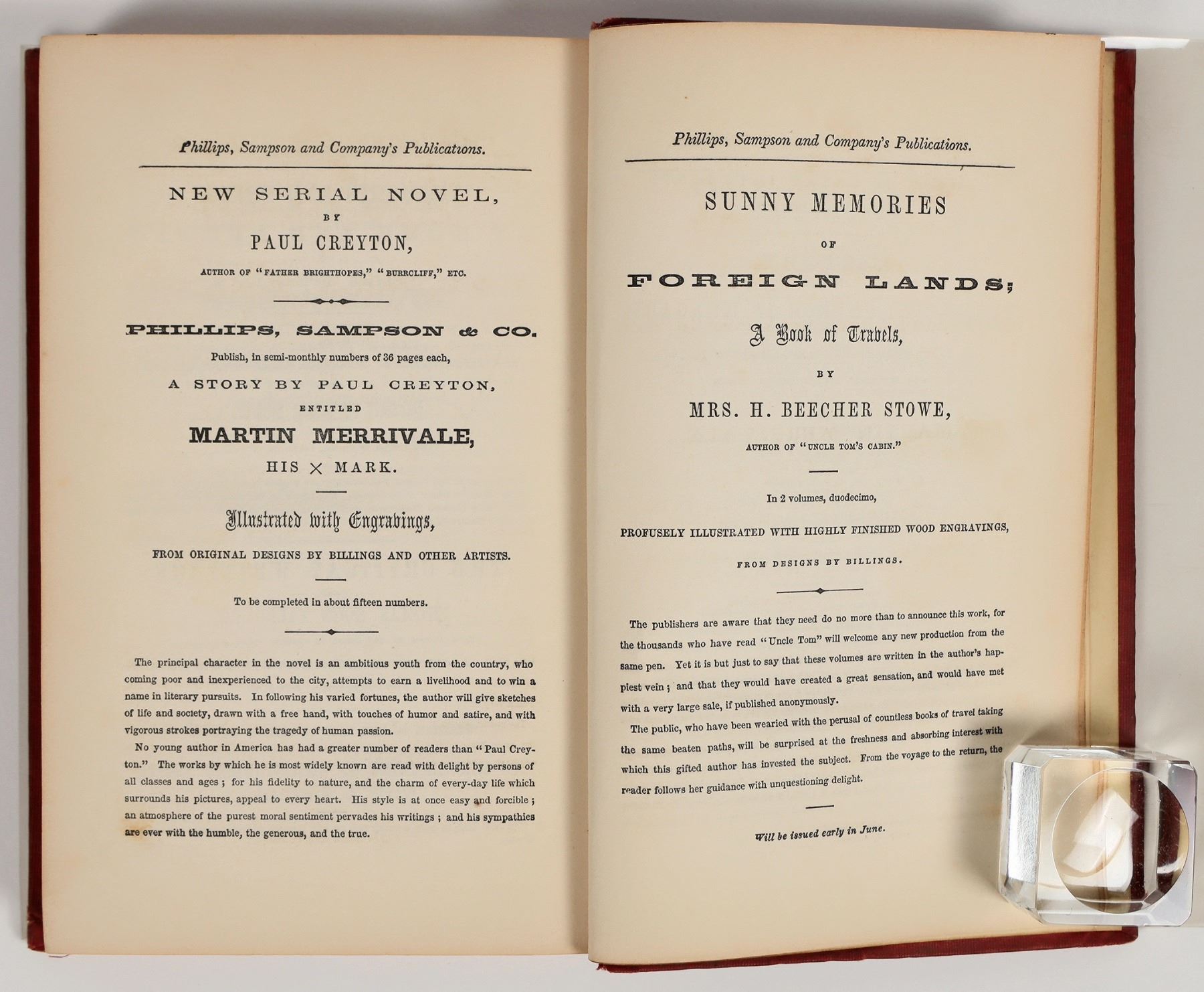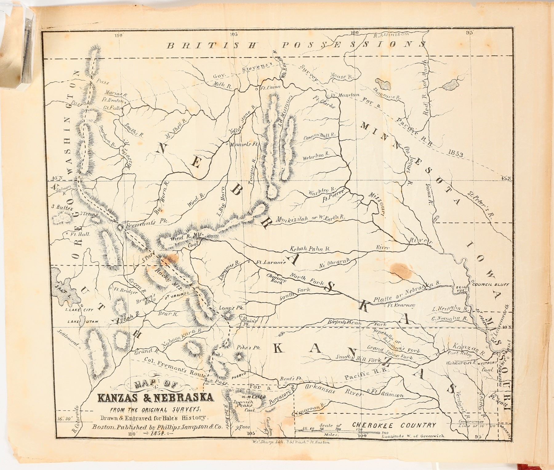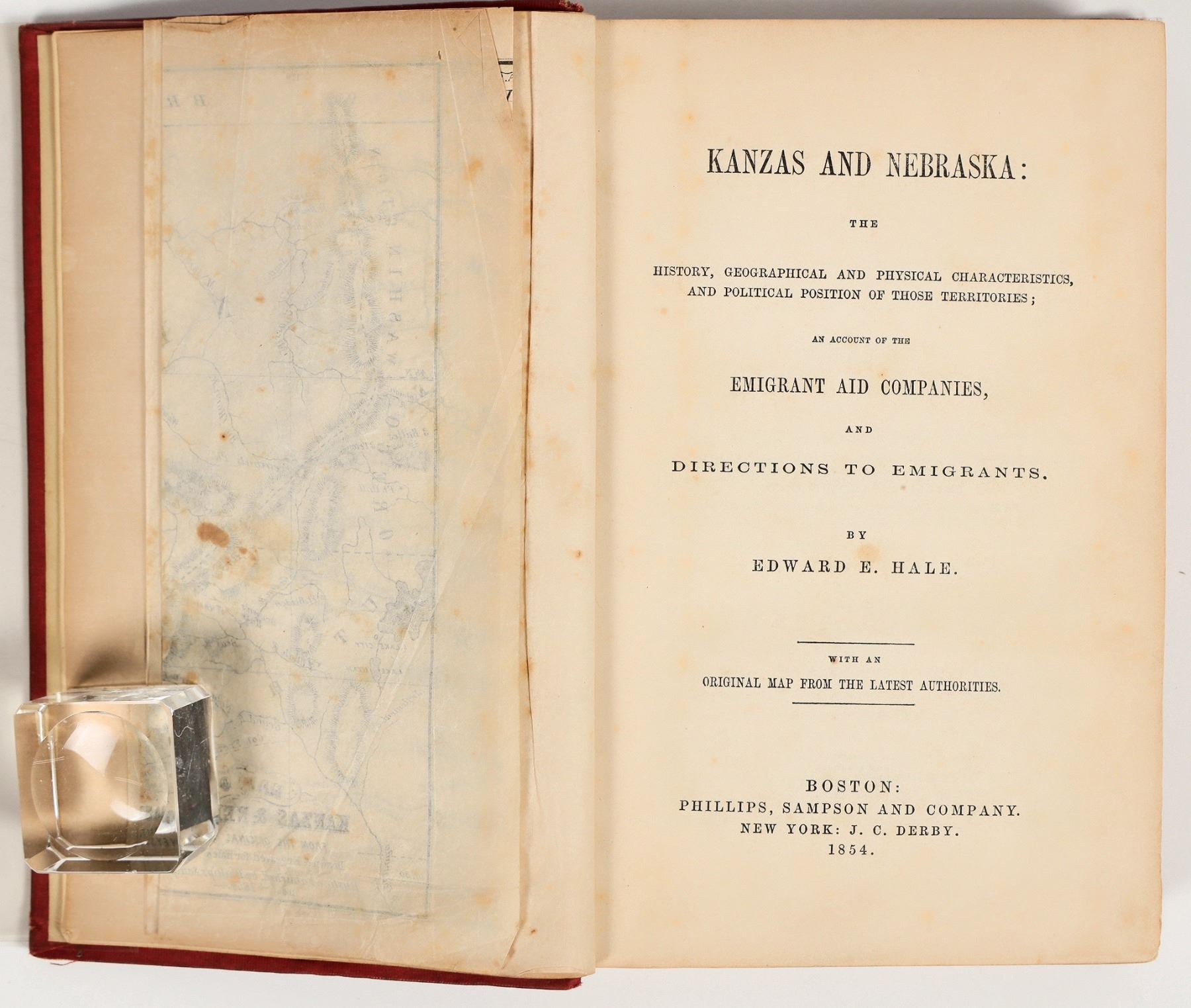 Kanzas and Nebraska: The History, Geographical and Physical Characteristics, and Political Position of Those Territories; An account of the Emigrant Aid Companies, and Directions to Emigrants. By Edwin E. Hale. With an original map from the latest authorities. Published by Boston: Phillips, Sampson and Company, New York: J. C. Derby. 1854. First Edition. 256 pages, plus folding map and four pages ads. Blind and gilt stamped red cloth covers. Covers have some small stains and scuffing. Corners are bumped and worn, with material worn off and some splitting. Foldout map is present in front of book and is wrinkled. Overall very good condition for age. See photos.