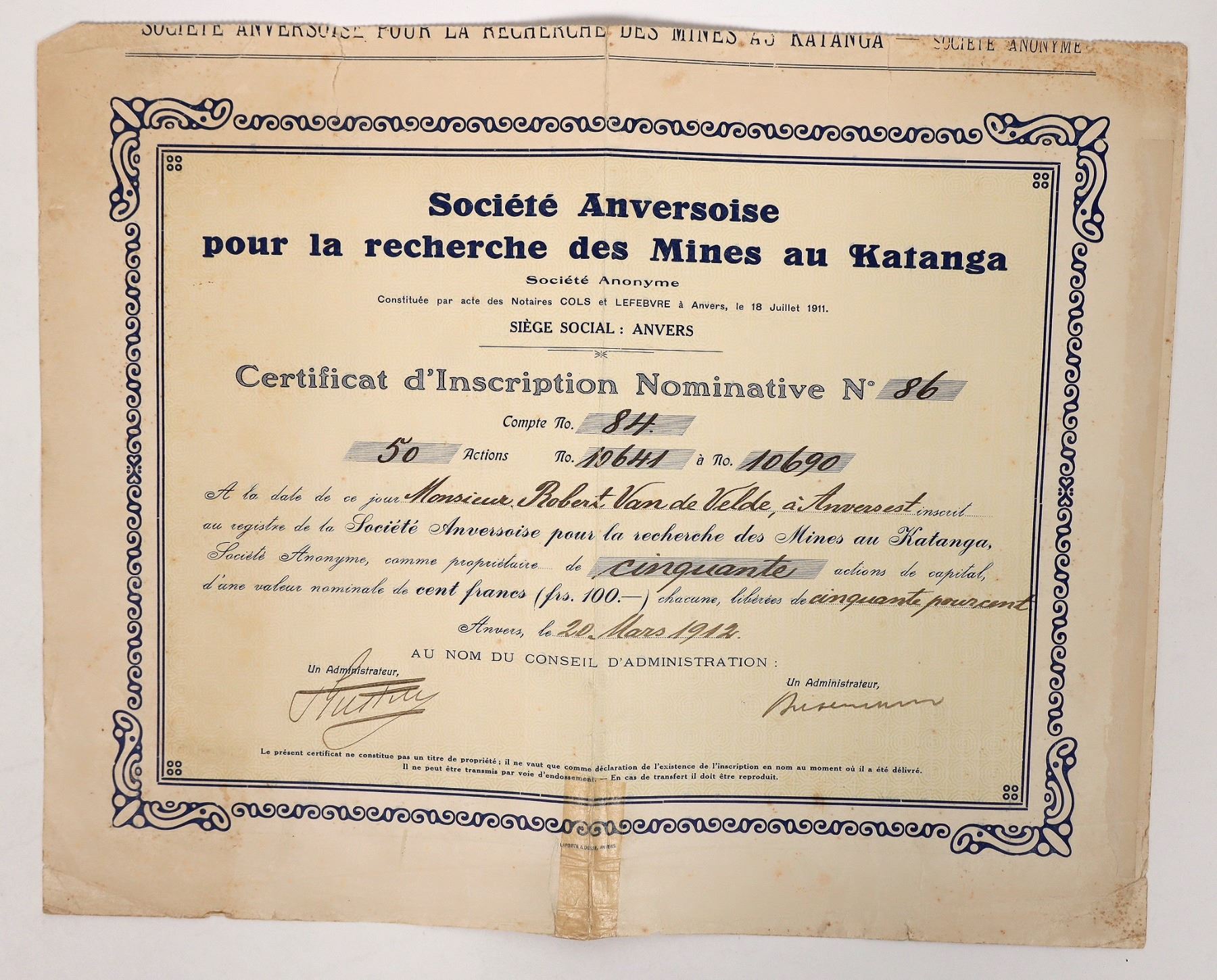 1912 Societe Anveroise pour la recherche des Mines au Katanga stock. Some foxing, tape repair, 1.2" tear. Please inspect.