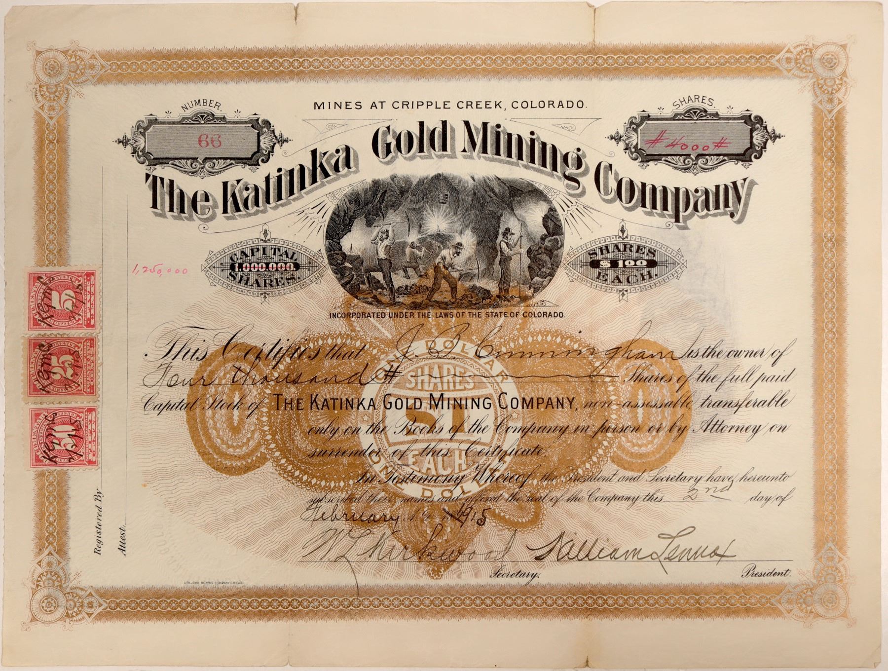 Rare because it is self-identified, "Mines at Cripple Creek, Colorado." Rare because it has a Revenue Imprint type underprint in brown. Number 66 for 40000 shares to JB Cunningham. Signed by Kirkwood and William Lennox president. 1915. Underground mining vignette. Border issues; one inch rip upper right, smaller rips at fold edges, wrinkle upper left, etc. 50c, 25c, and 5c documentary stamps. The beauty of the stock is not affected. 1,000,000 in capital stock has been crossed out and 1,250,000 written in. "Charles Walden continues to prosecute development on the Katinka claim on Guyot hill but to date no permanent shoot has been disclosed in the deep workings some 1,200 feet from surface. The property is under lease to the Progressive Gold Mining and Development company. The Katinka group, including the Katinka, Hobo, August, Flower and Chicken Hawk lode mining claim,s is owned by the Katinka Gold Mining company, a close corporation controlled by Colorado Springs capitalists ." [Mining Investor, 1912]  City: Cripple Creek  State: Colorado  Date: 1915
