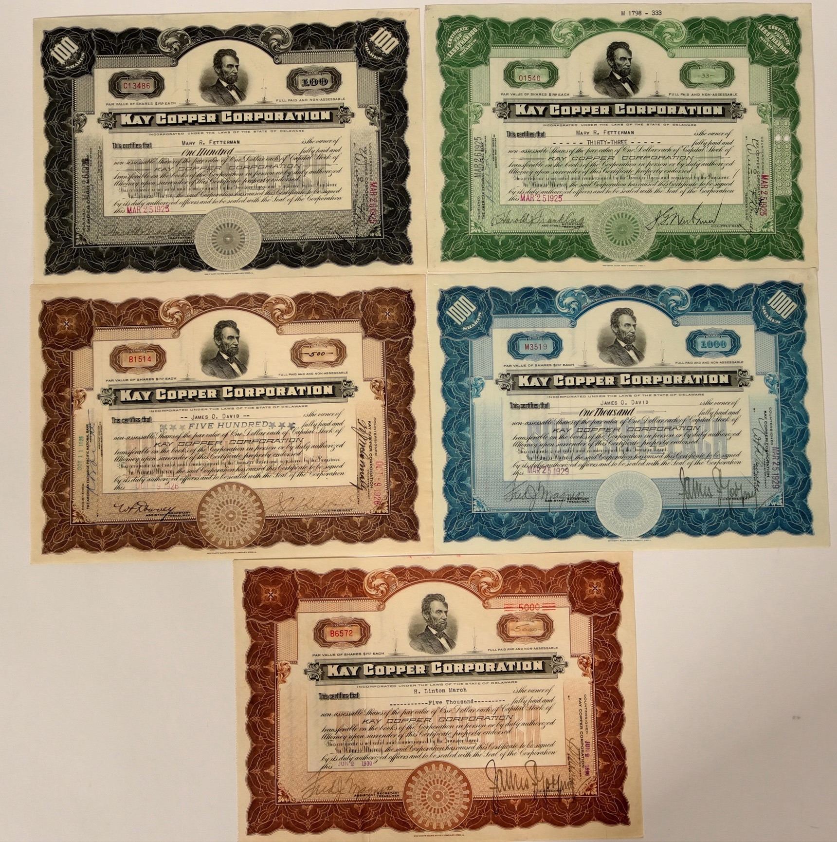 Lot of 5, four varieties. Issued 1925-1930. All have the same vignette of Abraham Lincoln. None are cancelled. Black, blue, brown, or green borders. Security Bank Note Company. 8 x 11.5" Pinholes, folds. Located at Black Canyon City, Black Canyon District, Wickenburg Mts, Yavapai Co., Arizona, according to mindat.org. Discovered 1910. Produced 1910 to 1966.