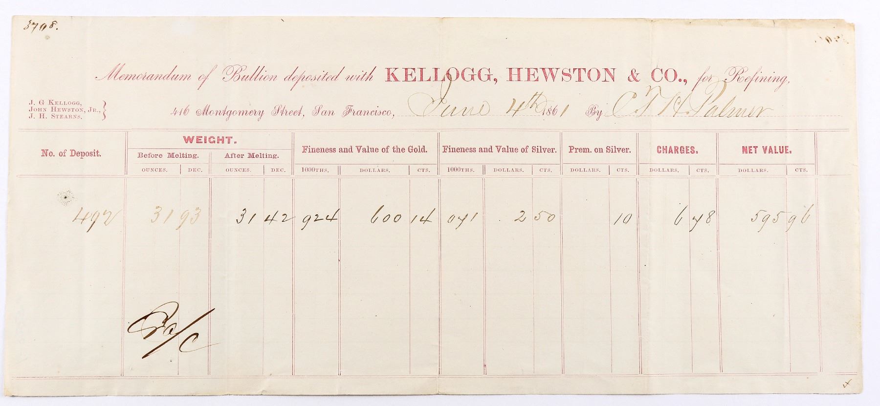 Kellogg, Hewston & Co., for Refining, 416 Montgomery St., San Francisco, CA, June 4, 1861. No. 492 Memorandum of Gold Bullion deposited by C.T.H. Palmer. This receipt is somewhat different in design from that of preceding Kellogg & Hewstons and reflects the address change from 108 to 416 Montgomery Street. Some differences include red ink printing, no vignette, and added columns for ìPrem. on Silver, and ìFineness and Value of Silver. Lists names of partners: J. G. Kellogg, John Hewston Jr., and J. H. Stearns on upper left. Weight before melting 31.93 oz, After melting (the same) 31.42 oz, Gold Fineness .924, Net value $595.96. Very Fine. Kellogg, Hewston & Co. were the successors of Kellogg & Humbert in 1860-61 and were also the predecessors for a short period. The company occupied the same building as Kellogg & Humbert and kept the same, J.G. Kellogg and John Hewston Jr. staff and added J.H. Sterns as the third partner of the company. Some of the Kellogg, Hewston and Co. bullion receipts have a vignette of the building at the left, in the same manner as the Kellogg & Humbert receipts. Kellogg & Hewston printed bullion receipts in red without a vignette of the building starting at the beginning of 1861. These receipts differ from the black receipts with the building because they were receipts issued specifically for refining, while the black receipts were issued for assay and payment. A few of these receipts come from the Hardy & Kennedy archive of Forest Hill, though the rarity R6 is significantly higher than Kellogg & Humbert with perhaps thirty known pieces. The rarity of the red refining receipt is unknown but thought to number less than ten pieces. R7. The group here comes from a variety of different sources including some of the C.T.H. Palmer archive, one of the early gold rush bankers from the Sacramento region. Interestingly, John Hewston was a well-known metallurgist during his time and he accompanied world famous western landscape artist Alfred Bierstadt and artist friends Enoch Wood Perry and Virgil Williams on an expedition to Yosemite in 1863. The famous painting, ìAlong the Mariposa Trail, painted by Williams in 1863 depicts these four men at camp in Yosemite. Size: 12 x 5.25 inches. San Francisco California 1861