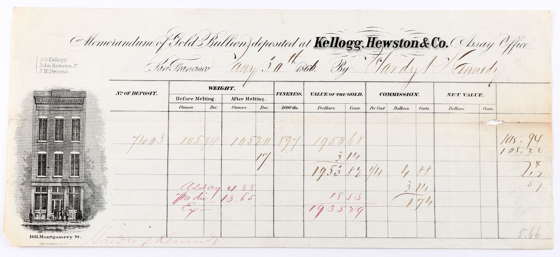 Kellogg, Hewston & Co., Assay Office 108 Montgomery St., San Francisco, CA, Jan 30, 1861, No. 7403 Memorandum of Gold Bullion deposited by Hardy & Kennedy. Same style or design as above receipt with vignette of Assay office location at 108 Montgomery Street. Lists names of partners: J. G. Kellogg, John Hewston Jr., and J. H. Stearns on upper left. Weight before melting 105.94 oz, After melting 105.24, Fineness .897, Net value $1935.24. In red ink is the notation on fees and the names of the Forrest Hill merchants, Hardy & Kennedy, (William H. Hardy & Samuel S, Kennedy, Reference Placer County Directory 1861) at the bottom. This certificate is an example of some of the great rarities that were produced by the Hardy & Kennedy archive of Forrest hill during the latter part of the gold rush. Black printing on bluff Paper. Printed by Lith of Britton & Co. S. F. Very Fine. Size: 12 x 5.25 inches. San Francisco California 1861
