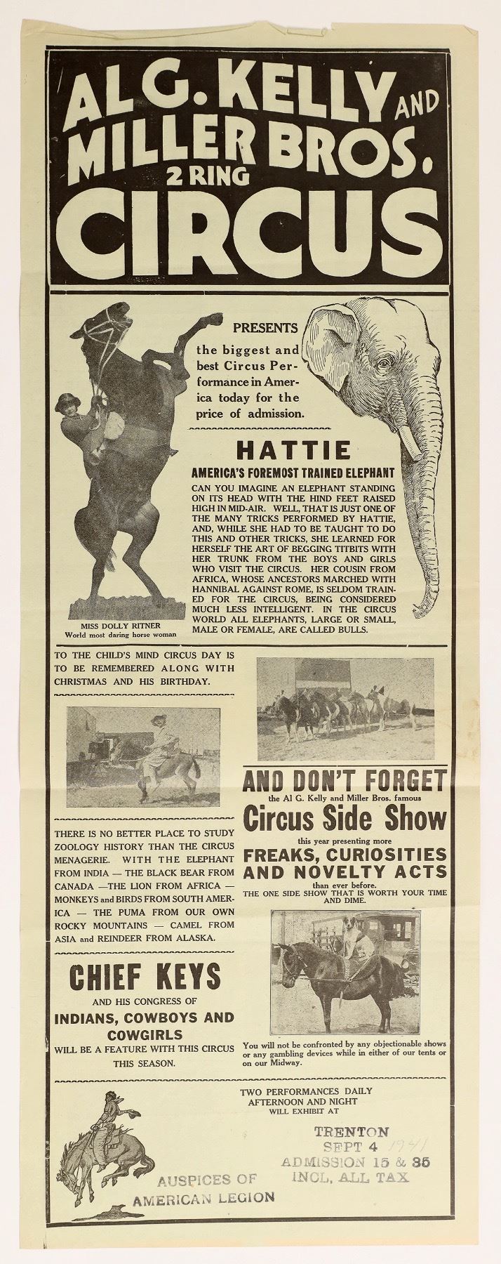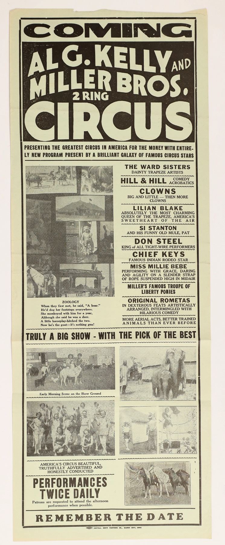 Kelly & Miller Bros. Circus broadside, "The Greatest Circus in America For the Money". 23x9", top creased and folded on back.