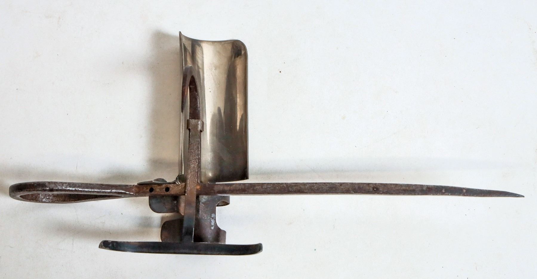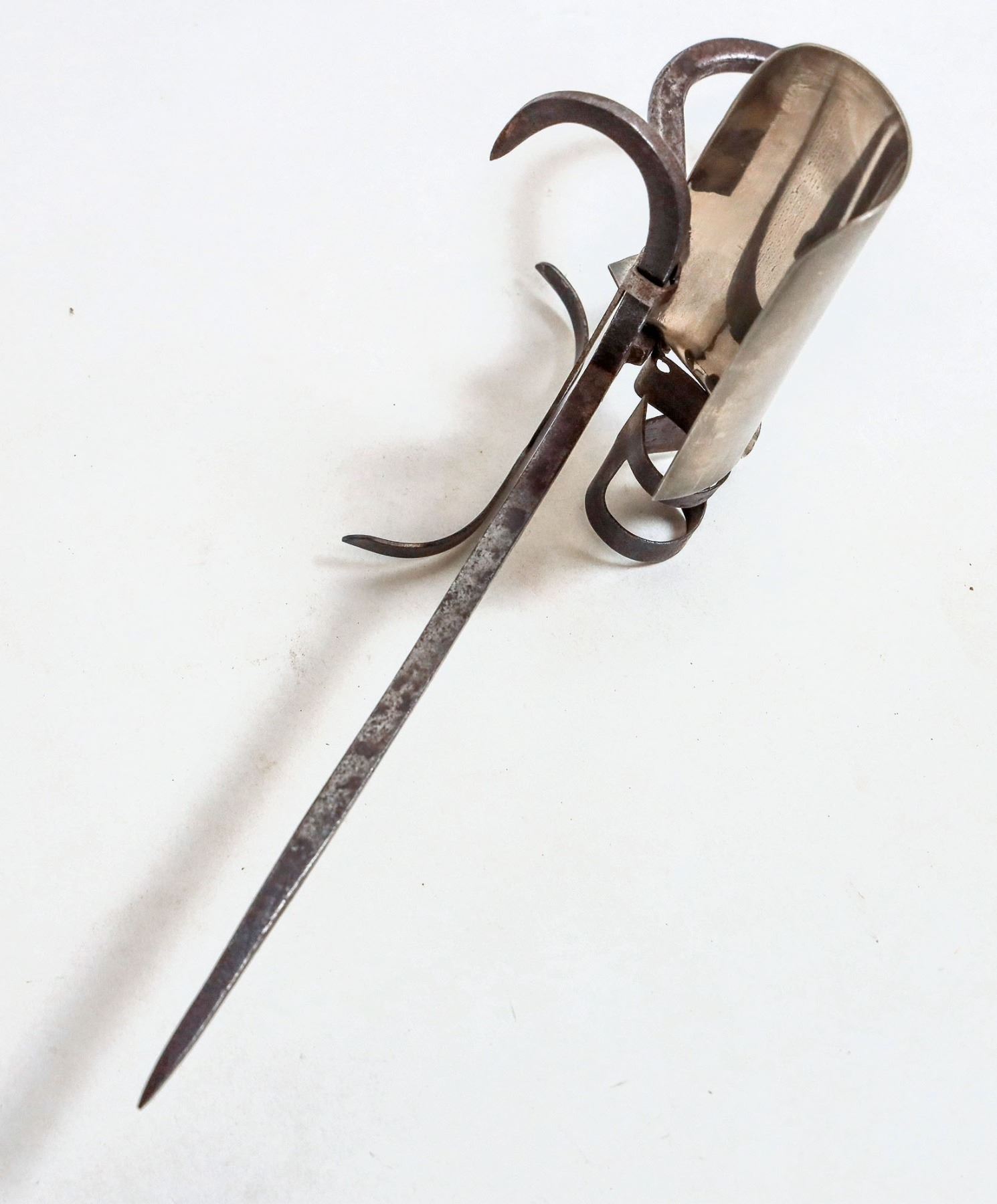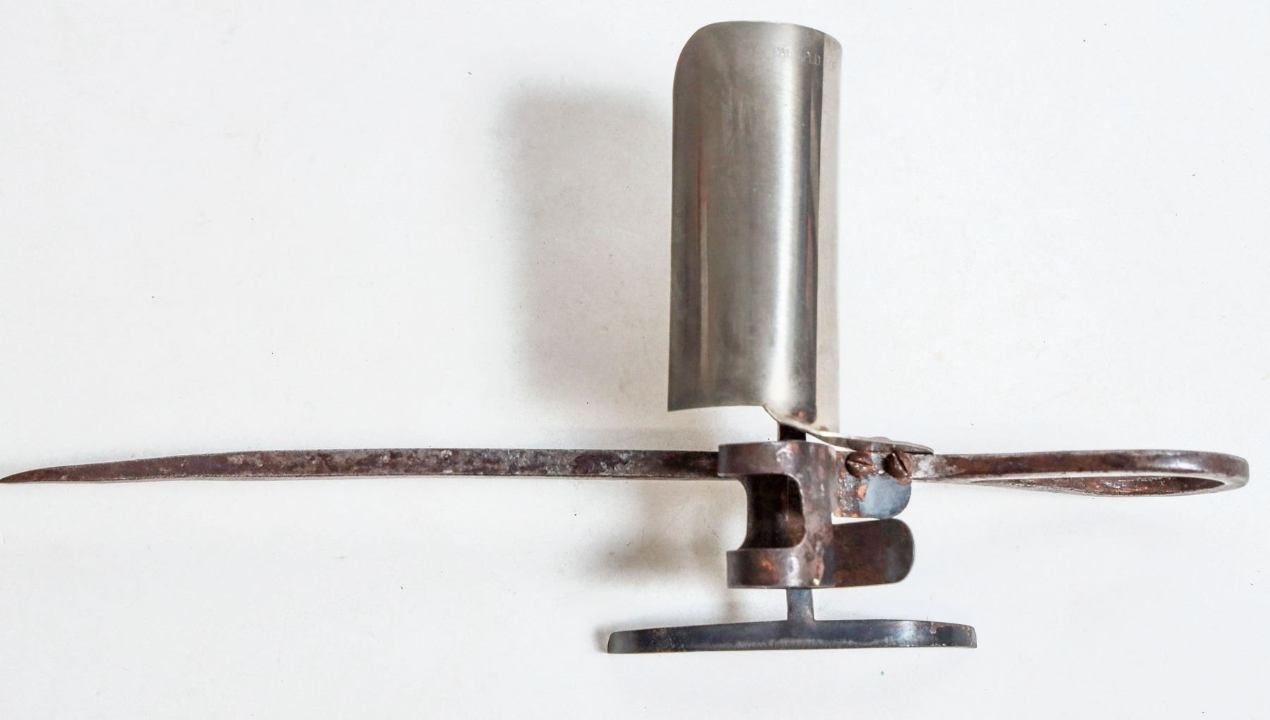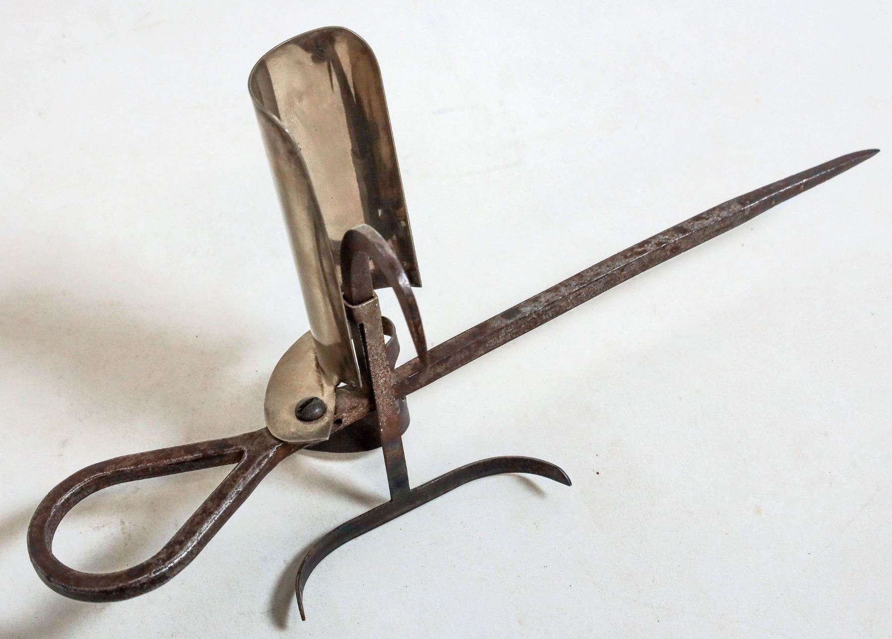 Kelly minors candlestick, 1909, exceptionally rare. This is an extremely rare Kelly patented stick shown in Wilson Bo Brink as number 186, manufactured in Salt Lake City Utah in 1909. At the time of the publication of the book only two samples were known. This stick is in particularly nice condition with only very minor rust on portions of the stick. 11 1/2 inches long overall height 5 1/2 inches. [ Salt Lake City Utah