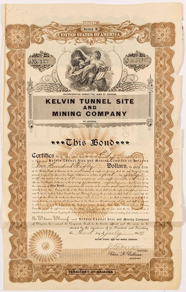 Rare! Issued to ES Johnstone. $250. Signed by president JD Ferree. The 1910 American Globe mentions that this mien and the Southern Bell are giving evidence of becoming large producers. In 1914 (only four years later) the Muncey Magazine reports "...the Kelvin Tunnel Site Company as 'apparently moribund'". 14.5 x 9.25". Major rips including one that protrudes into writing at middle left. Date: 1909 Location: Kelvin, Arizona HWAC# 56914