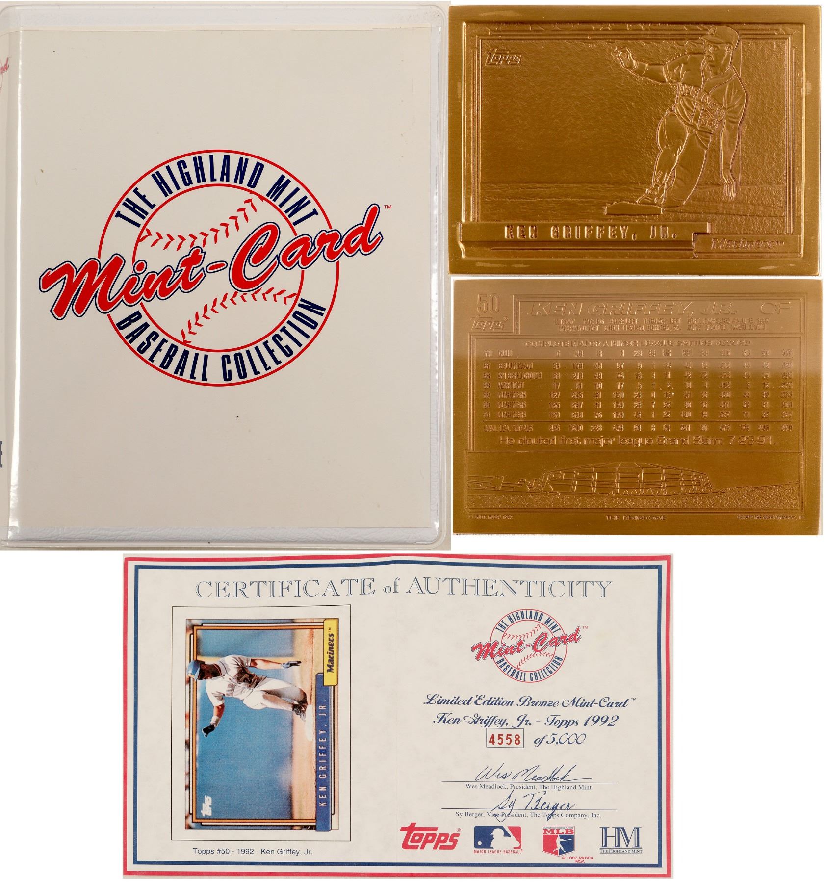 This is a bronze baseball card of Ken Griffey Jr. #4558/5000 from Mint-Card in the lexan protector complete with book jacket and letter of authenticity. Issued 1992.
