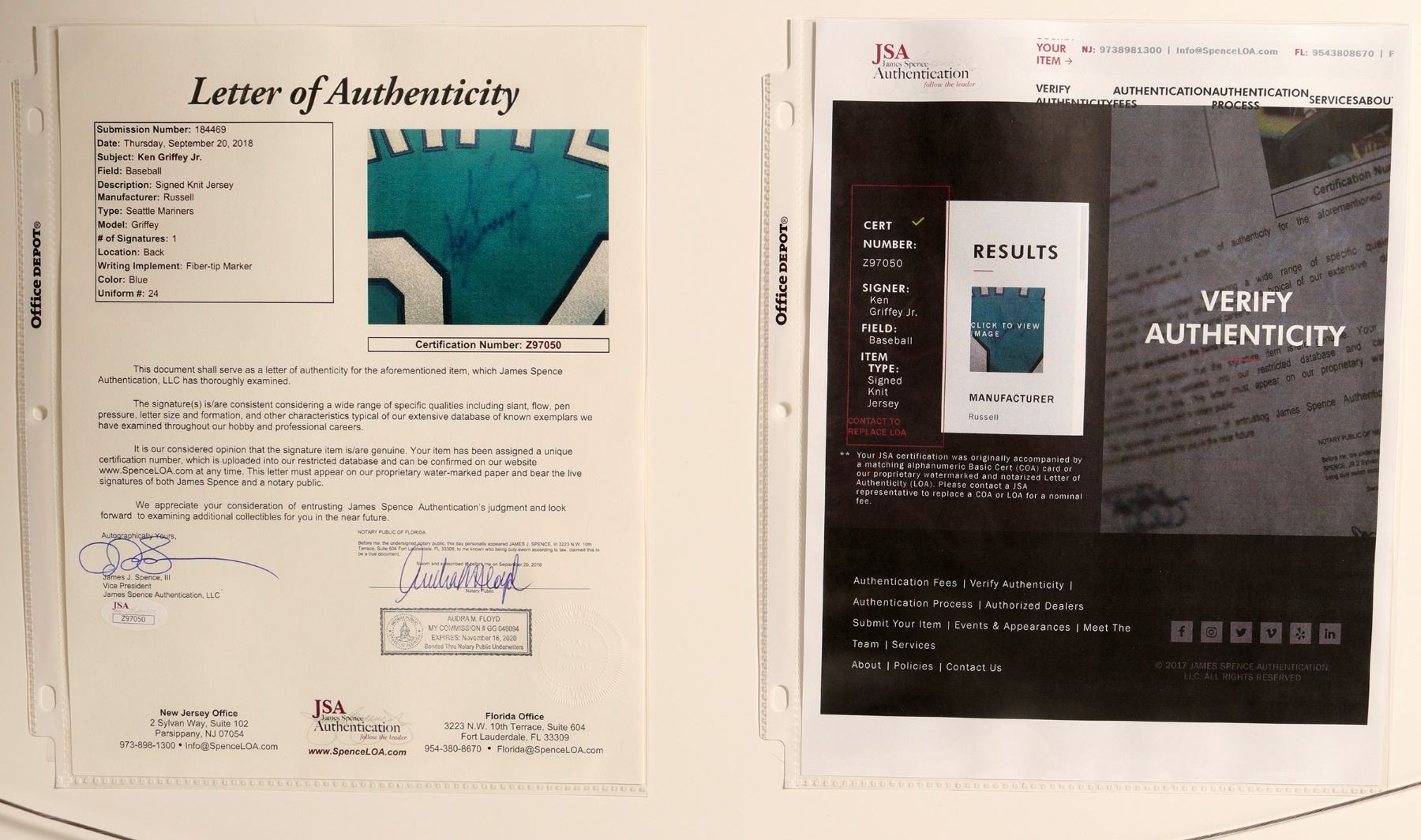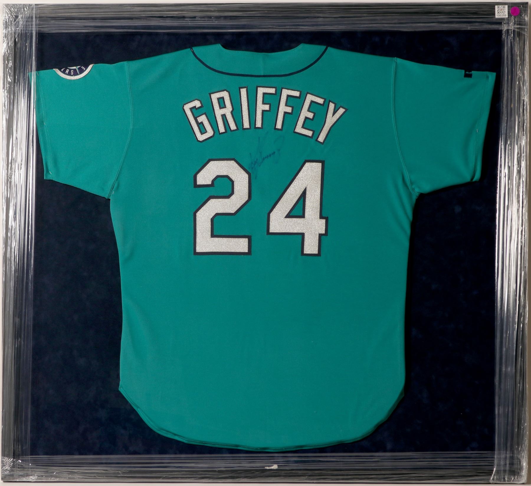 Mariner's jersey #24. Ken Griffiey's jersey in Mariner's green with silver lettering across the center signed in dark blue ink. JSA # Z97050 certification plus letter of authenticity. Framed at 44 in. X 39 in.