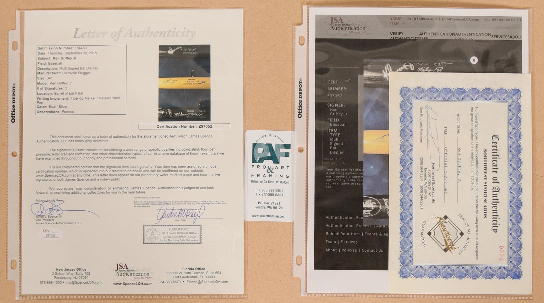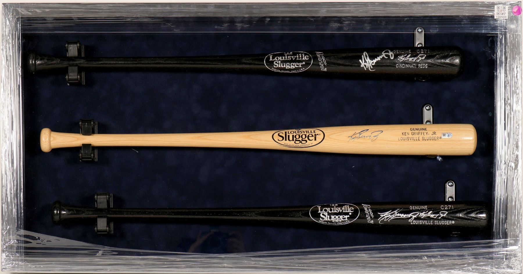 Three bats signed by Hall of Fame member Ken Griffey Jr. Two black Louisville Sluggers: "Genuine C271" and Genuine C271 Cincinnati Reds", both signed in silver pen. The third bat is a Louisville Slugger Ken Griffey Jr. model, signed at left in blue. The bats are presented in a beautiful black frame, 18 x 40 x 3.5". Authentication cert on back, Z97052, and a JSA cert.