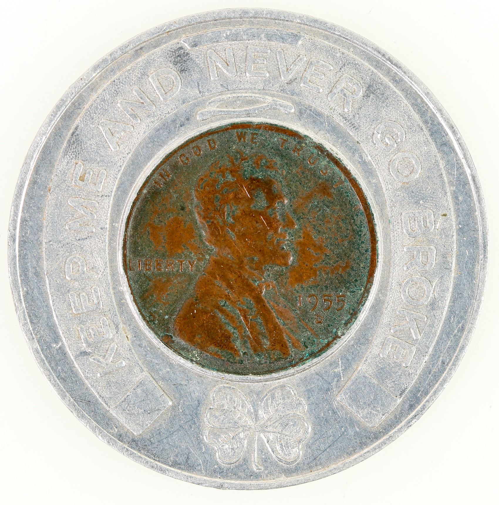 Kenmark Jewelers, corner of 17th at Welton, produced this 1955-D Lincoln cent in a "keep me and never go broke" aluminum collar. Coin is EF-AU condition with some verdigris.
