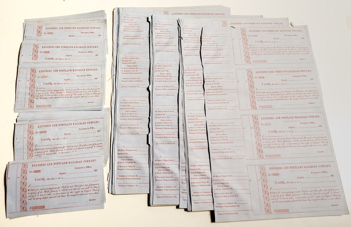Dozens of uncut check sheets from the Kennebec and Portland Railroad Co. with approximately 20 loose, blank checks. City: State: Date: Inventory# 38534