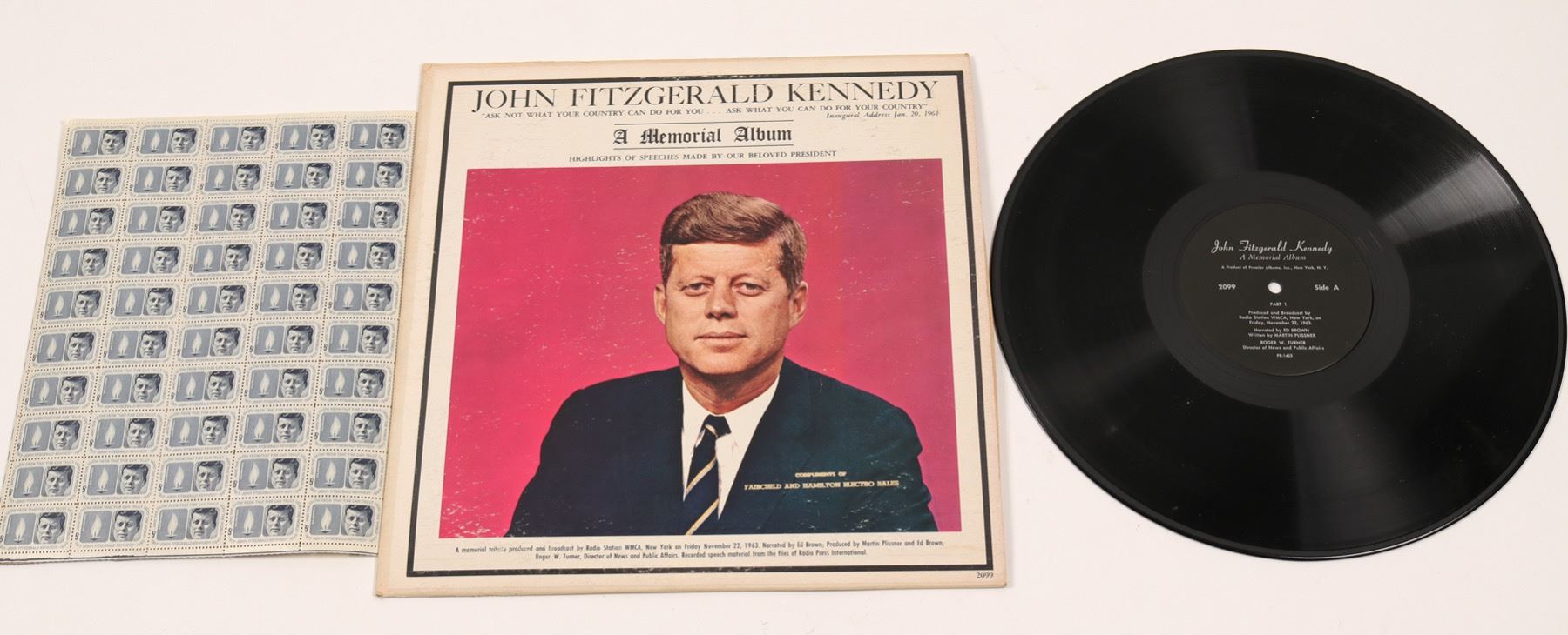 Item # 1 of 2: John F. Kennedy: A Memorial Album. A memorial tribute produced and broadcast by radio Station WMCA, New York on Friday, 22, 1963. It contains highlights of speeches made by our beloved president. Perfect condition with plastic cover, album cover and record jacket. Item # 2 of 2: Beautiful complete sheet of stamps, of "The Eternal Flame & JFK Portrait", 50, 5 cent stamps in a pale blue colorization. Issue date 2-29-1964 in Boston, Mass. Nice pair of Presidential Items. ( RH).