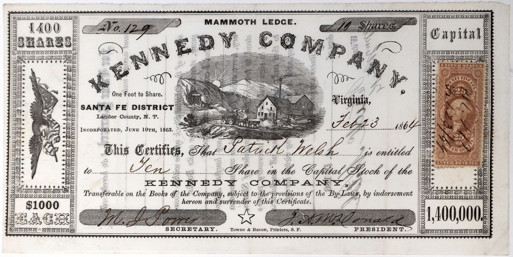 # 129 for 10 shares to Patrick Welsh. Signed by M. L. Power (Virginia City miner in 1863) and president J. A. McDonald. McDonald & Company made up of mostly Virginia City men played an important role in the Santa Fe Mining District. Includes information on the district and the Guadalajara mining camp. Dateline February 23, 1864, Virginia. Incorporated June 10, 1863. 25c Power of Att'y revenue stamp. Not cancelled. Location: Mammoth Ledge, Santa Fe District, Lander County, N. T. The Mammoth Ledge was mentioned as one of the better ledges in the district. Mountain, mill and flag vignettes. Nice Loomis (with historical note) engraving vignette. Towne & Bacon printer. Cut unevenly top right. Fold bottom right corner. No edge, pin hole or discoloration issues.