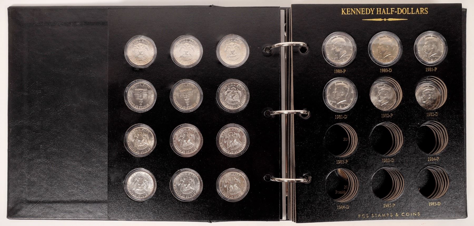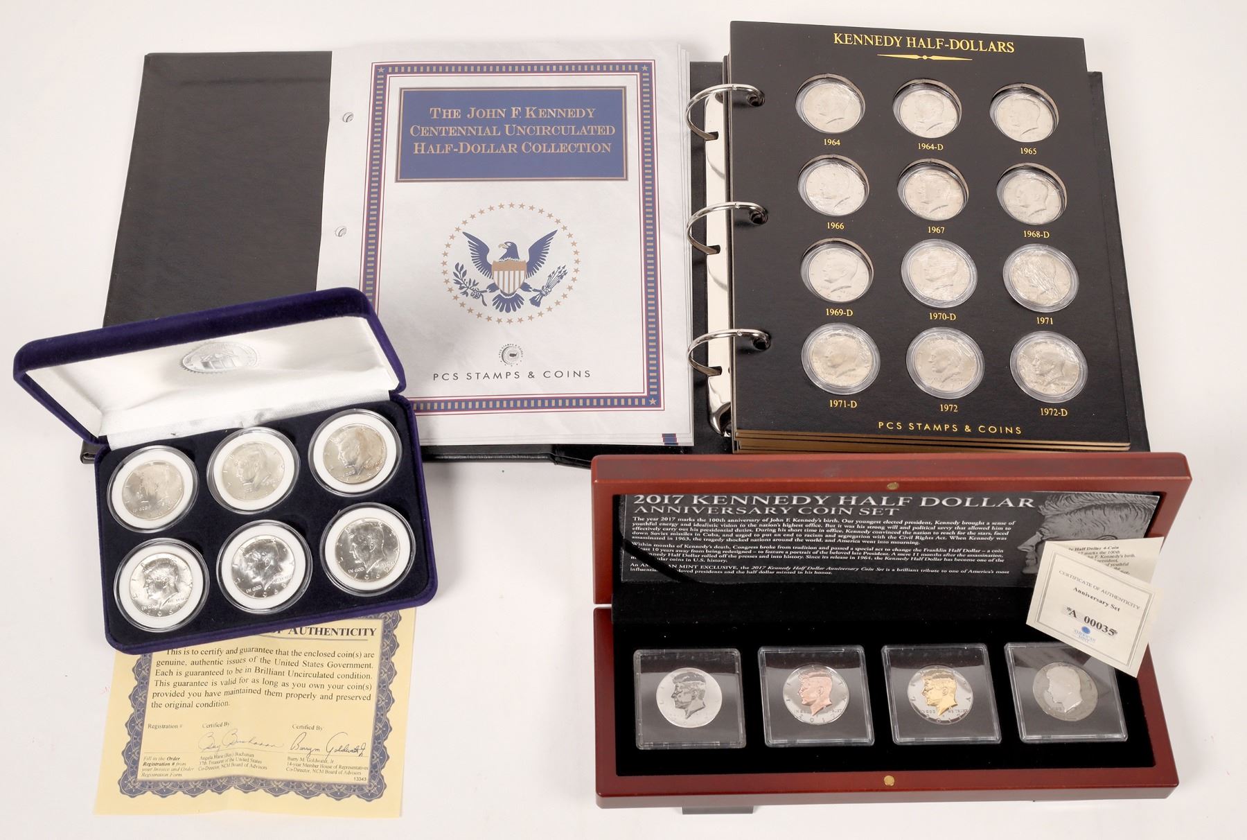Three tributes to the Kennedy half dollar. 1) Six brilliant uncirculated coins issued by National Collector's Mint in a 6 x 4 inch blue velour case. 1964-1969. With certificate of authenticity. 2) 2017 Kennedy Half Dollar Anniversary Coin Set. Issued by American Mint. 10 x 4 inch wooden case with four proof 2017 Kennedy half dollars, enhanced with white rhodium, rose gold, 24K gold and Ruthenium. 3) The John F. Kennedy Centennial Uncirculated Half Dollar Collection binder issued by PCS Stamps & Coins. 9 x 10 inch binder with 27 brilliant uncirculated half dollars and two $1 2015 presidential coins. No silver issues are present. Good opportunity to complete the set.