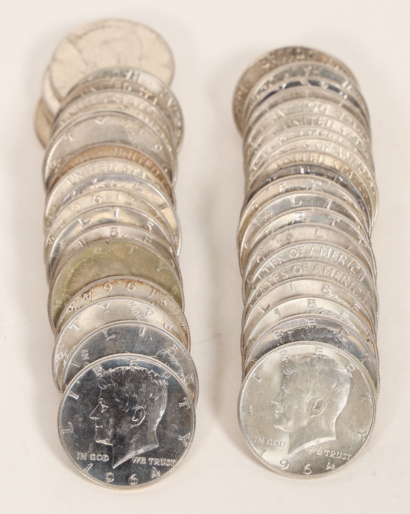 Lot of 44 Kennedy half dollars, all dated 1964, 90% silver. Many pulled from proof or uncirculated sets. Six have paper glue residue. [