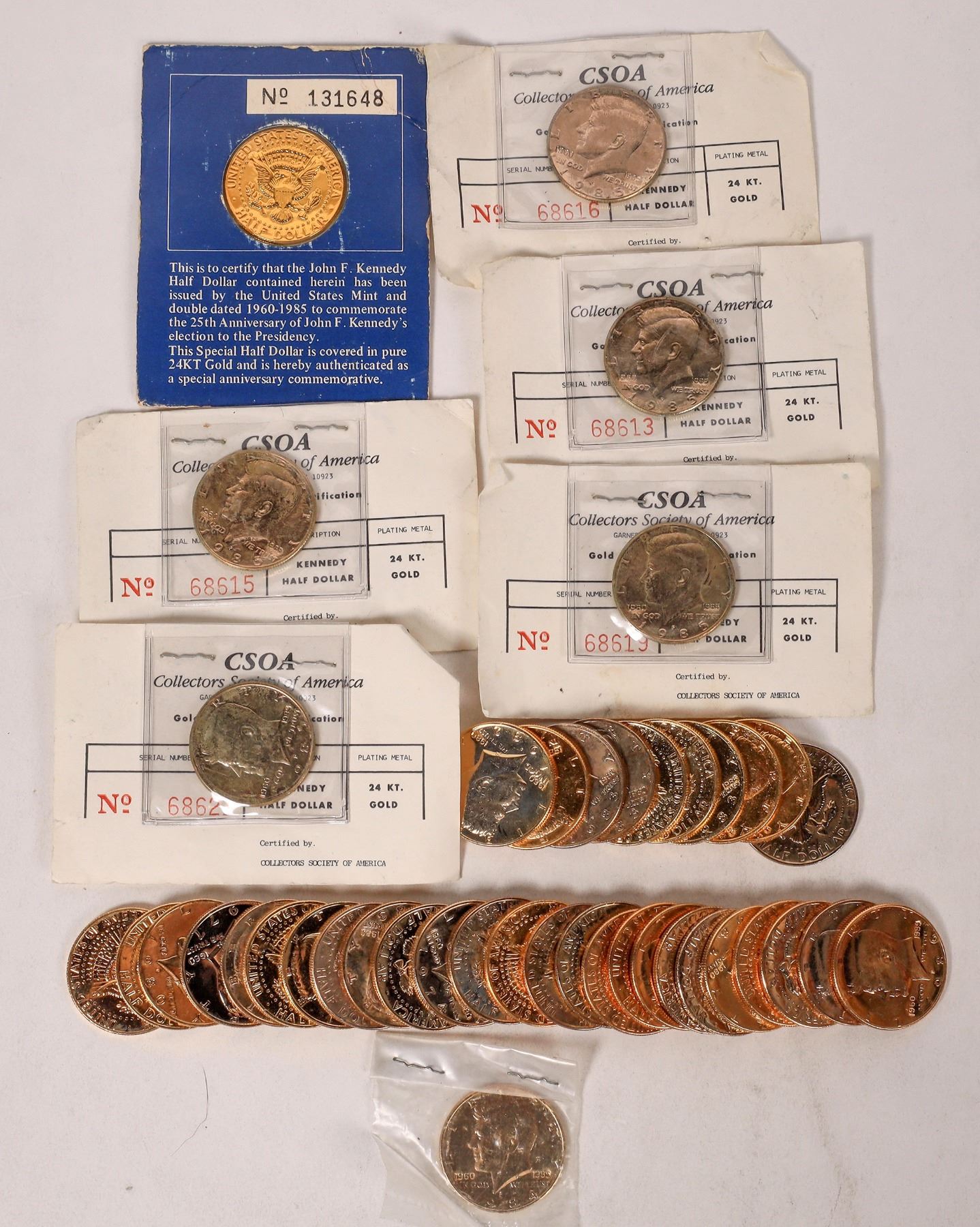Lot of 42 gold electroplated Kennedy half dollars. Five certified by Collectors Society of America. Most dates in the 1980, a few in the 1970s.