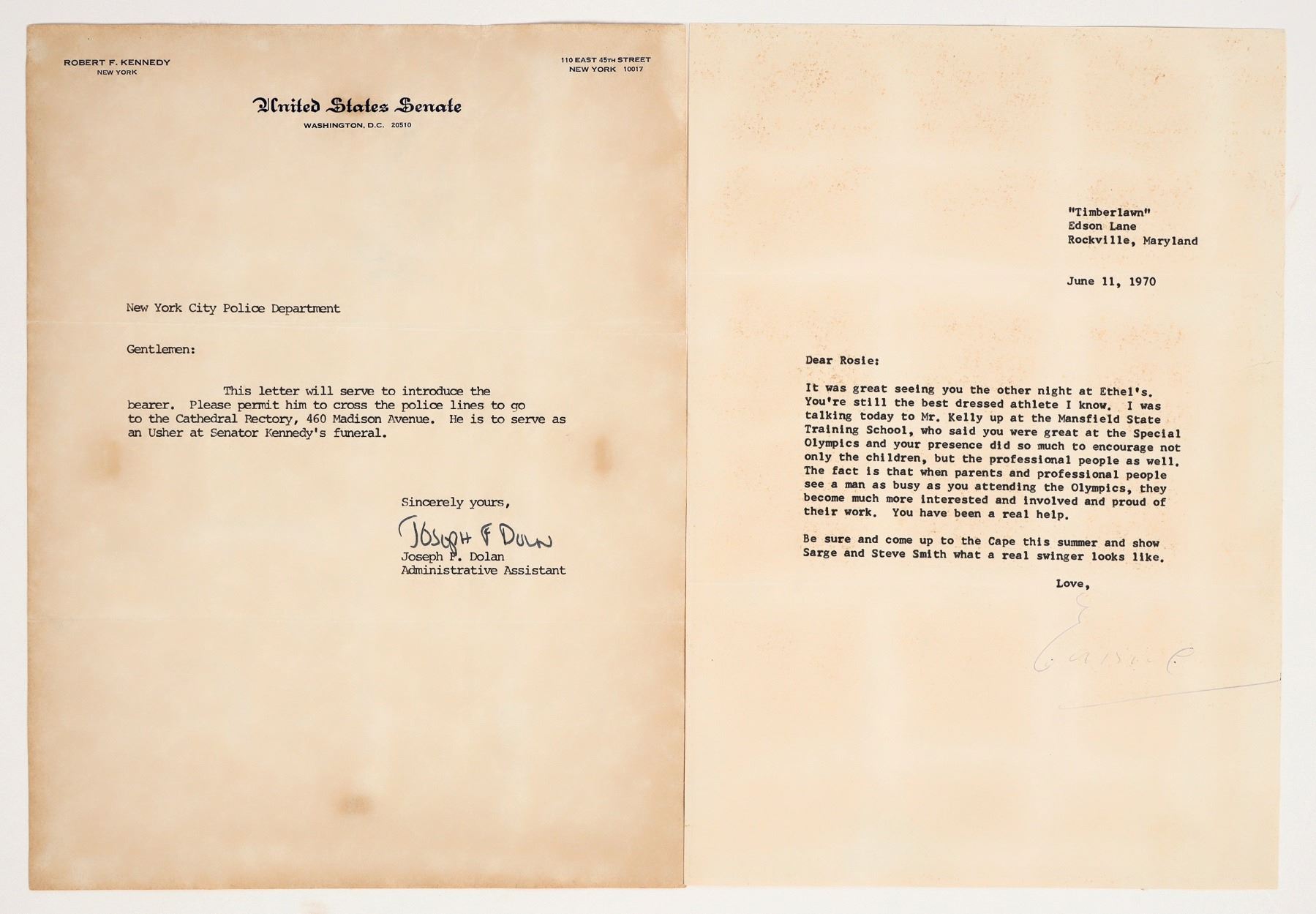Lot of 2. 1. Letter On Robert F. Kennedy Senate letterhead and signed by Joseph F. Dunn Admin asst. regarding Senators funeral 1968 2. 1970 letter from Eunice Kennedy-Shriver to an athlete named "Rosie" helping with the Olympics. Most likely Rosey Greer, although spelling is different.