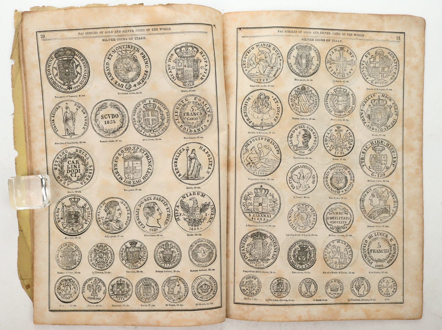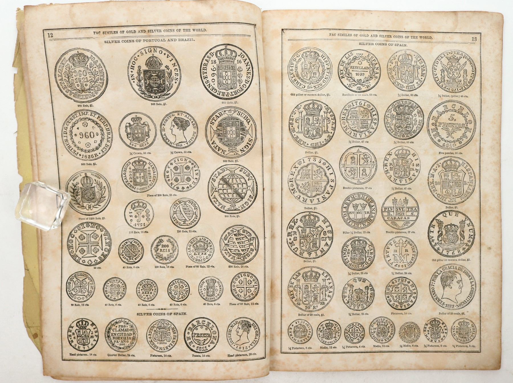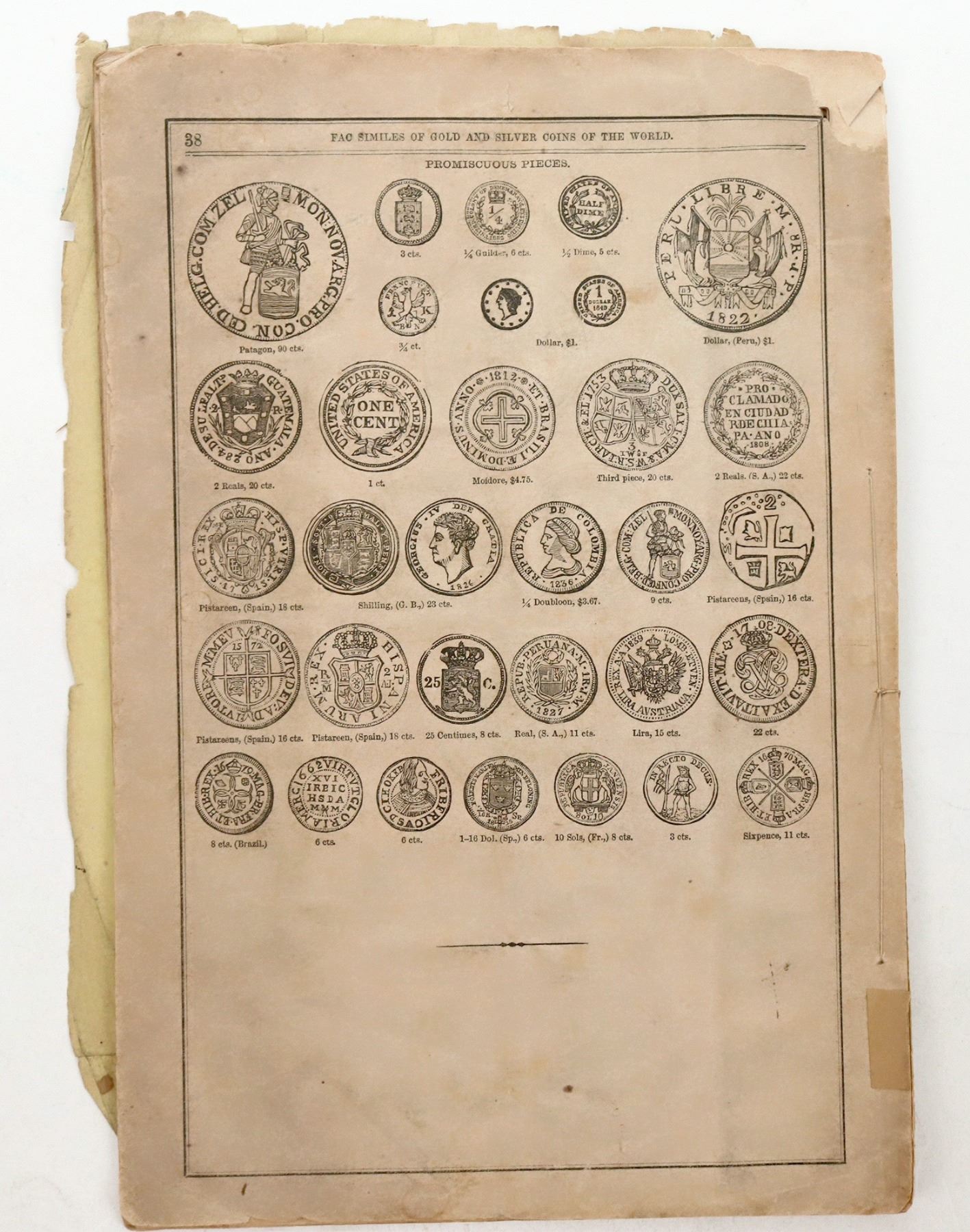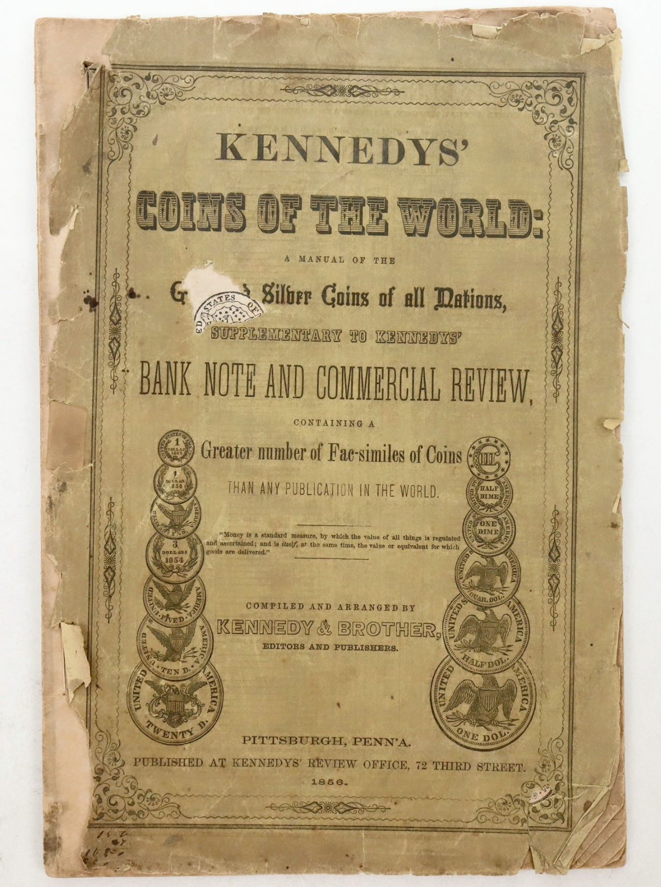 Paperback catalog 8 x 11 inches; 38 pages: Kennedys' / Coins of the World / A manual of the / Gold and Silver Coins of all Nations. Published at Kennedys' Review Office, 72 Third Street, 1856. Many facsimile illustrations. Includes Humbert $50 slug; Bechtler and Cal gold. Front cover detached, lacking back cover.