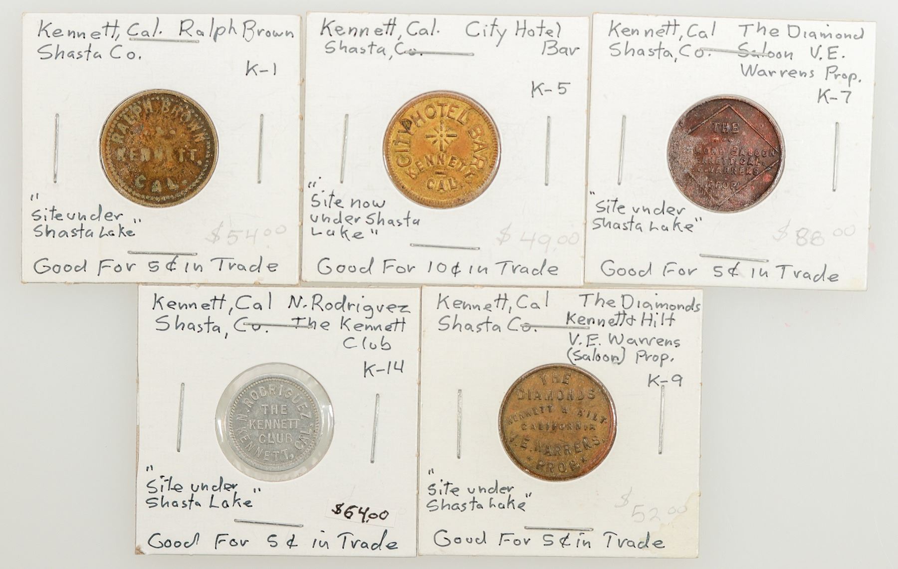 5 Kennett tokens. 2x The Diamond Saloon. N Rodriguez. City Hotel Bar. Ralph Brown. Kennett California
