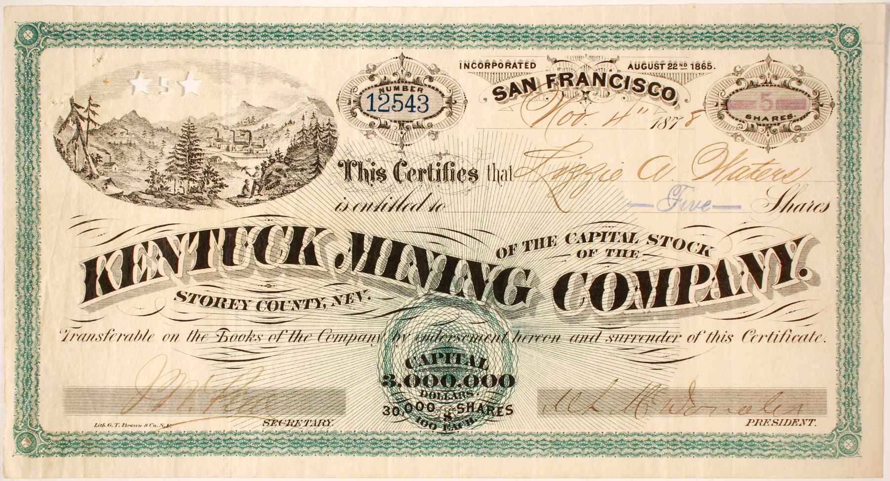 # 12543 for 5 shares to Lizzie A Waters. Signed by J Peal and president (?). Dateline San Francisco 1878. Incorporated August 22, 1865. Not cancelled. Shares $100 each. Different oval mountain mining vignette. G. T. Brown lithographer. G. T. Brown is San Francisco's legendary Black American lithographer. The Kentuck was one of the bigger Comstock producers reporting $5,763,295 production. In Gold Hill only the Yellow Jacket, and Crown Point reported more. "This mine is situated in the town of Gold Hill and constitutes a portion of the ground worked profitably with arrastras before the more northerly sections of the Comstock Lode were discovered. The surface rock here was rich in free gold and paid largely even when worked by the above simple means. The ores at greater depths having also produced gold equal to almost anything opened elsewhere on the great Washoe lode. The Kentuck occupies a position between the Yellow Jacket and Crown Point mines and is worked through the shaft of the latter." [United States Annual Mining Review and Stock Ledger, 1879] Prag Collection State: Nevada City: Gold Hill Date: 1878 HWAC# 85260